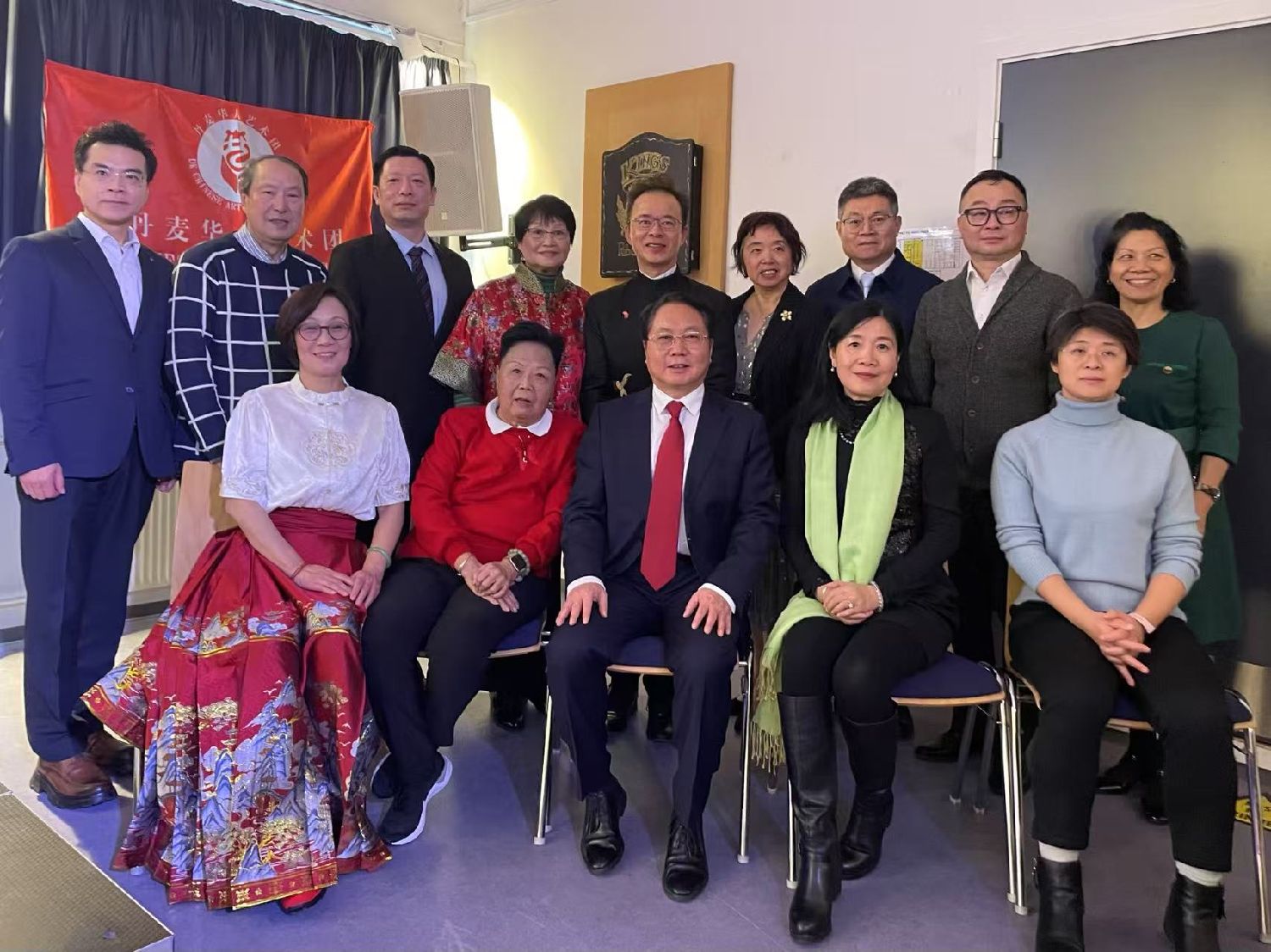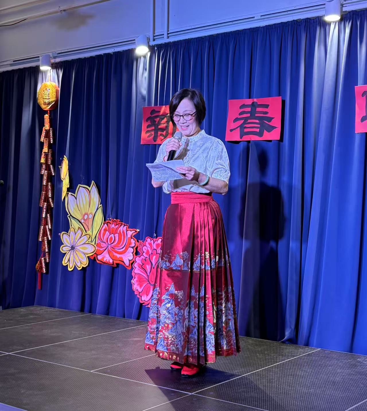 首先由磨红玲团长致辞,她回顾总结了艺术团成立至今十八年的用艺术传播中华文化的历史和经历。特别是在2024年艺术团参加了Gladesax、哥本哈根等地的文化节,参加了科灵孔子商学院的文化活动,还参加了“哥本哈根龙舟文化节”,并且受中国驻丹麦大使馆的邀请,参加了庆祝国庆75周年的表演。丹麦华人艺术团的成长离不开新老团员的共同努力与奋斗,感谢使馆对我们艺术团的大力支持!
