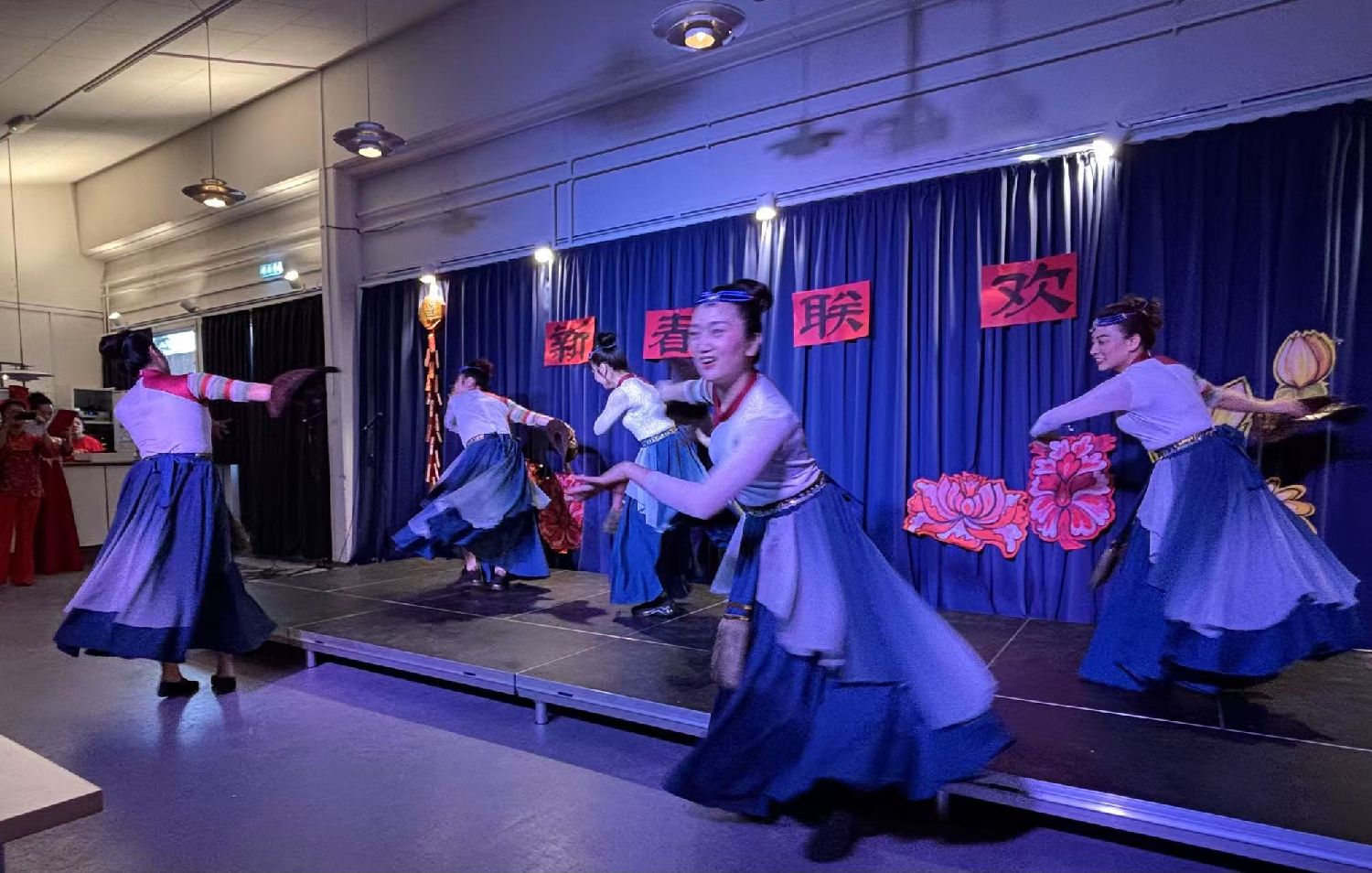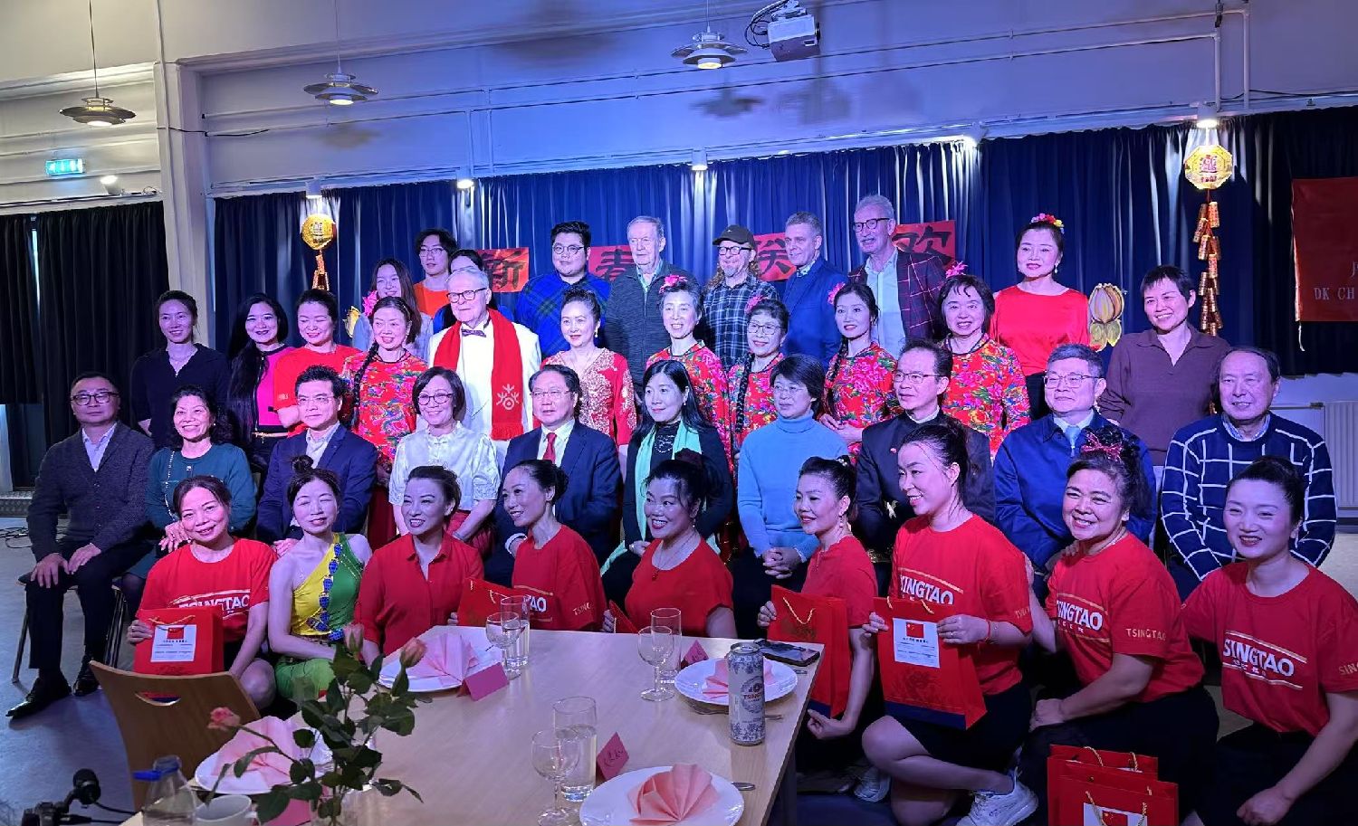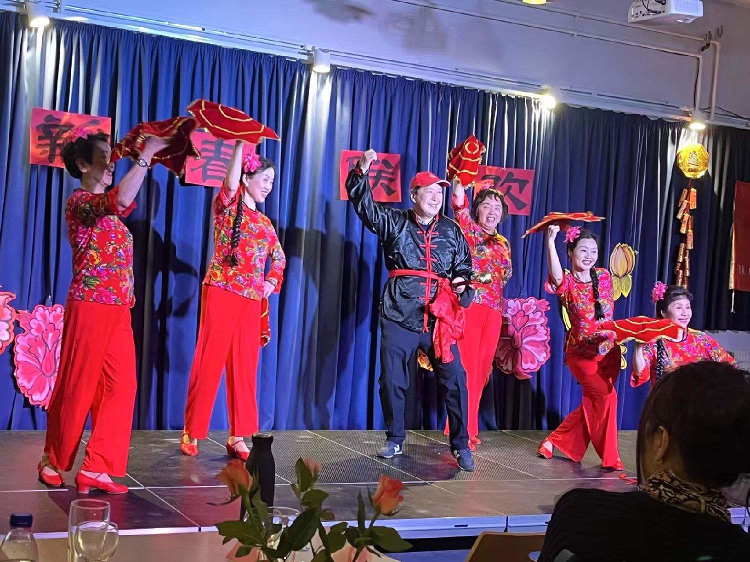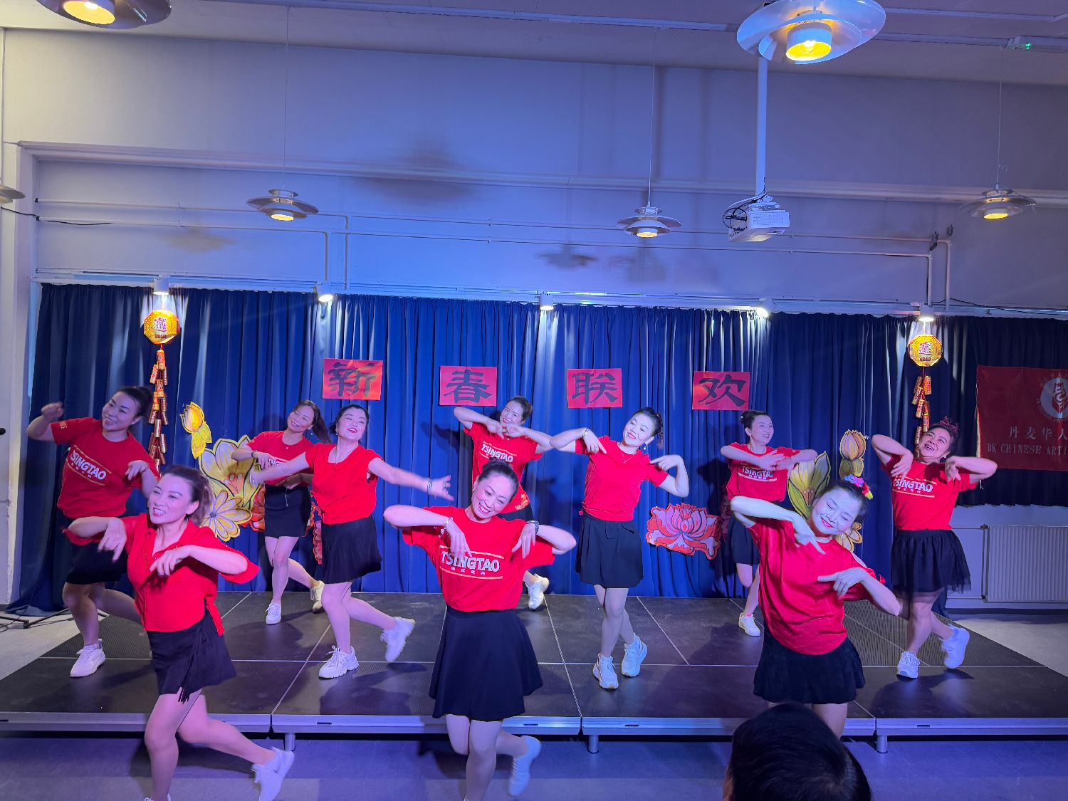 9:30Gladesax文化城近百人的聚会厅已经充满了中国年的年味,“新春联欢”四个大字悬挂在临时舞台上,繁花簇拥着这四个大字。左侧悬挂着“丹麦华人艺术团”的旗帜。来自“浙里有爱”的对联、小灯笼、“福”字悬挂在四周。真是善气洋洋!