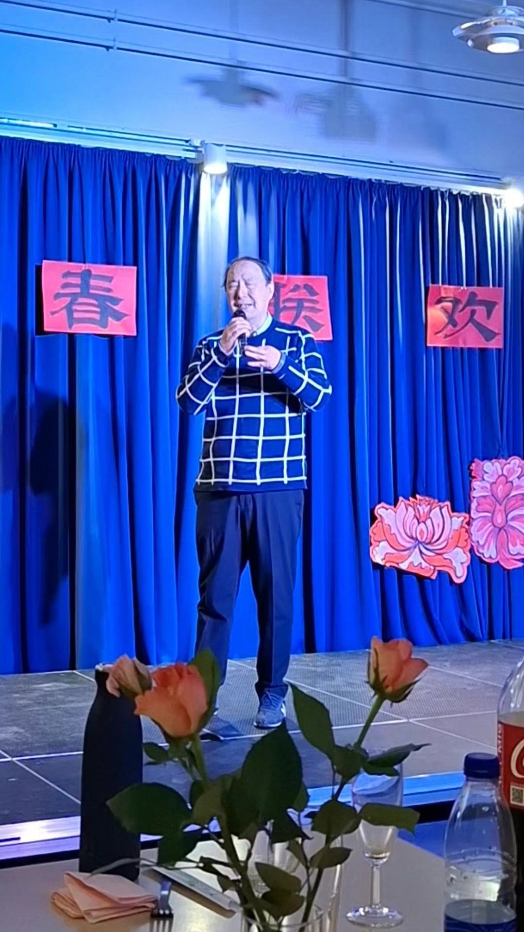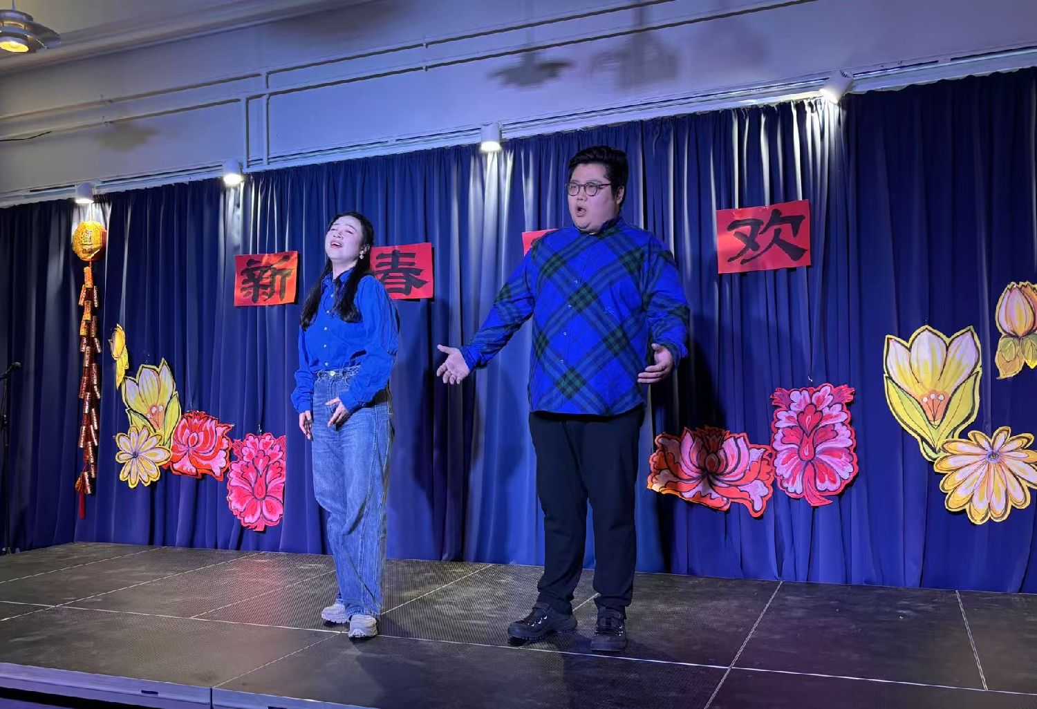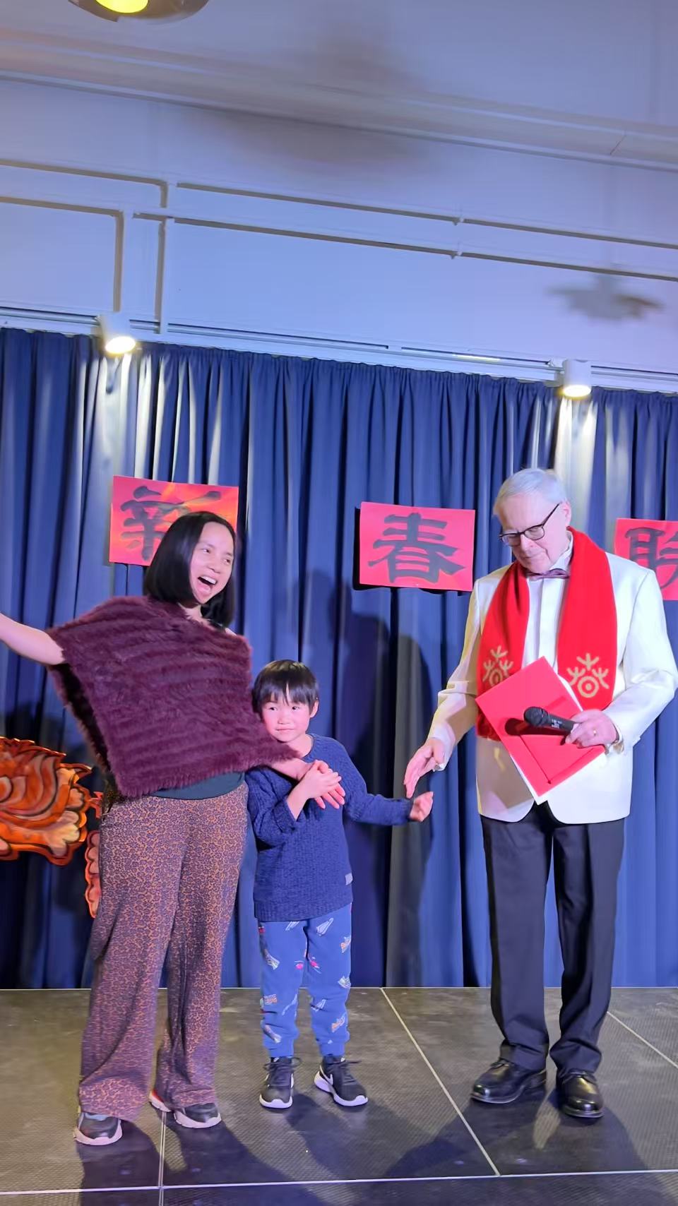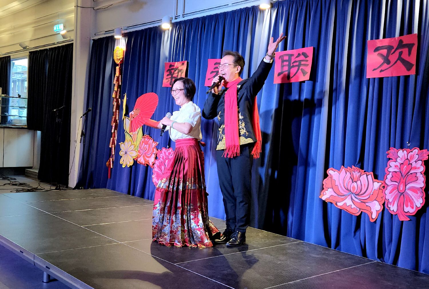 9:30Gladesax文化城近百人的聚会厅已经充满了中国年的年味,“新春联欢”四个大字悬挂在临时舞台上,繁花簇拥着这四个大字。左侧悬挂着“丹麦华人艺术团”的旗帜。来自“浙里有爱”的对联、小灯笼、“福”字悬挂在四周。真是善气洋洋!