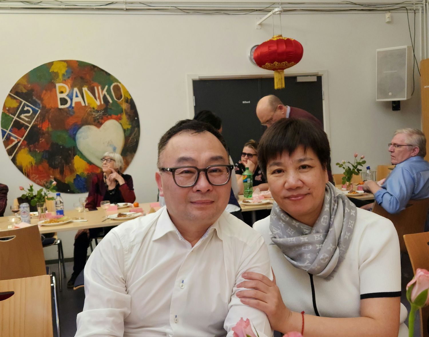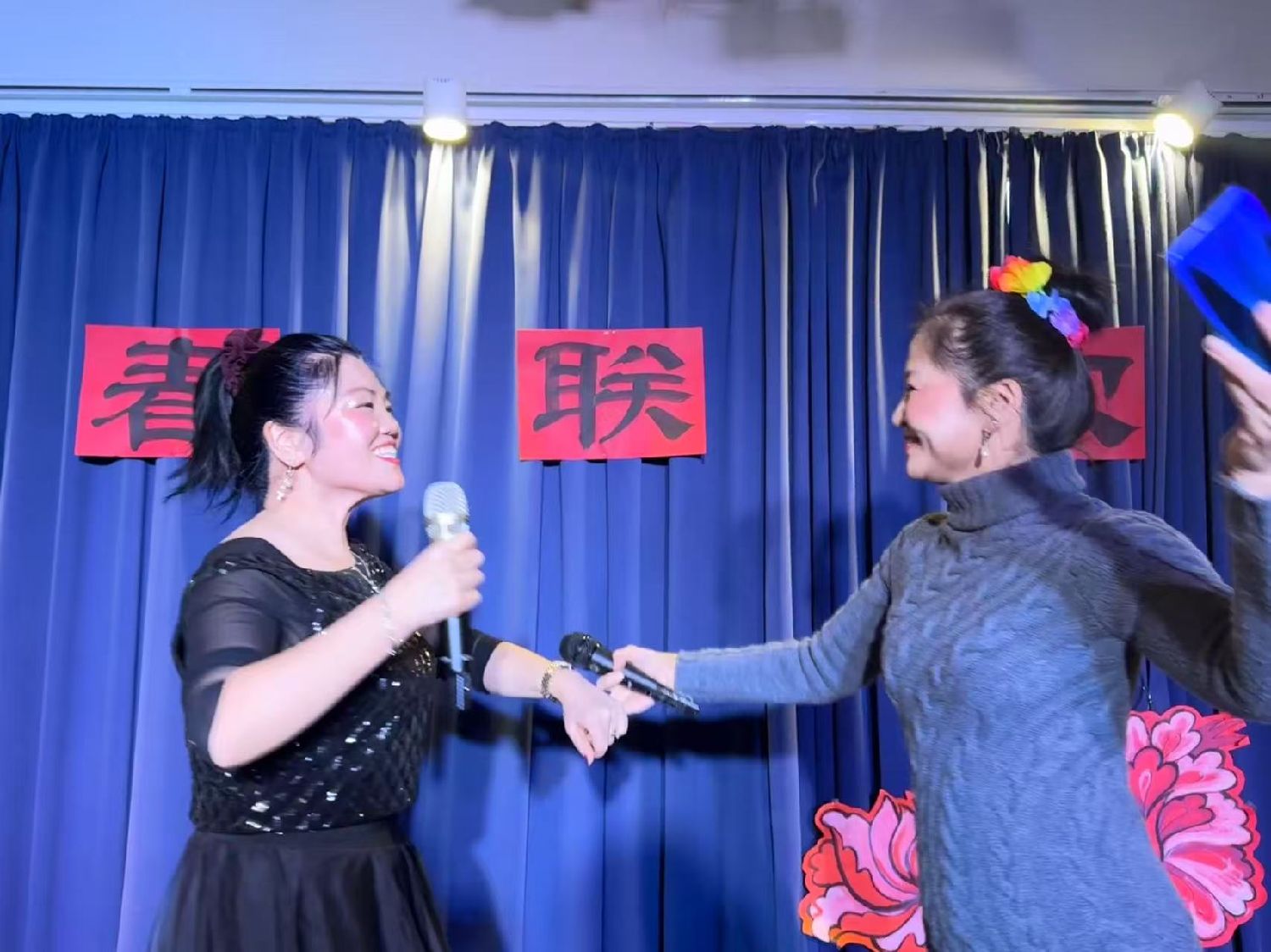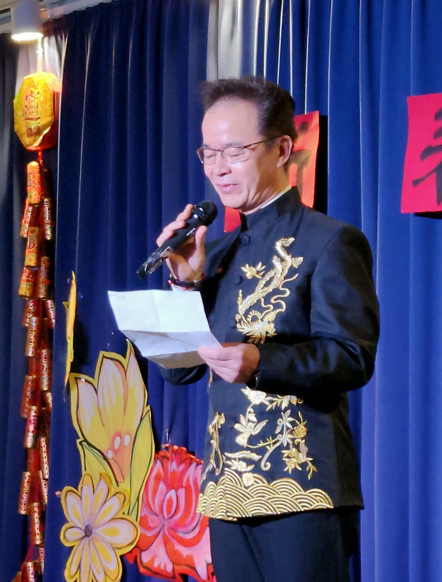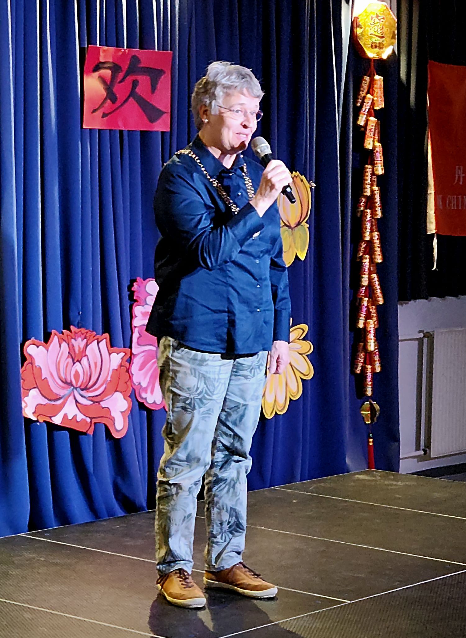 9:30Gladesax文化城近百人的聚会厅已经充满了中国年的年味,“新春联欢”四个大字悬挂在临时舞台上,繁花簇拥着这四个大字。左侧悬挂着“丹麦华人艺术团”的旗帜。来自“浙里有爱”的对联、小灯笼、“福”字悬挂在四周。真是善气洋洋!