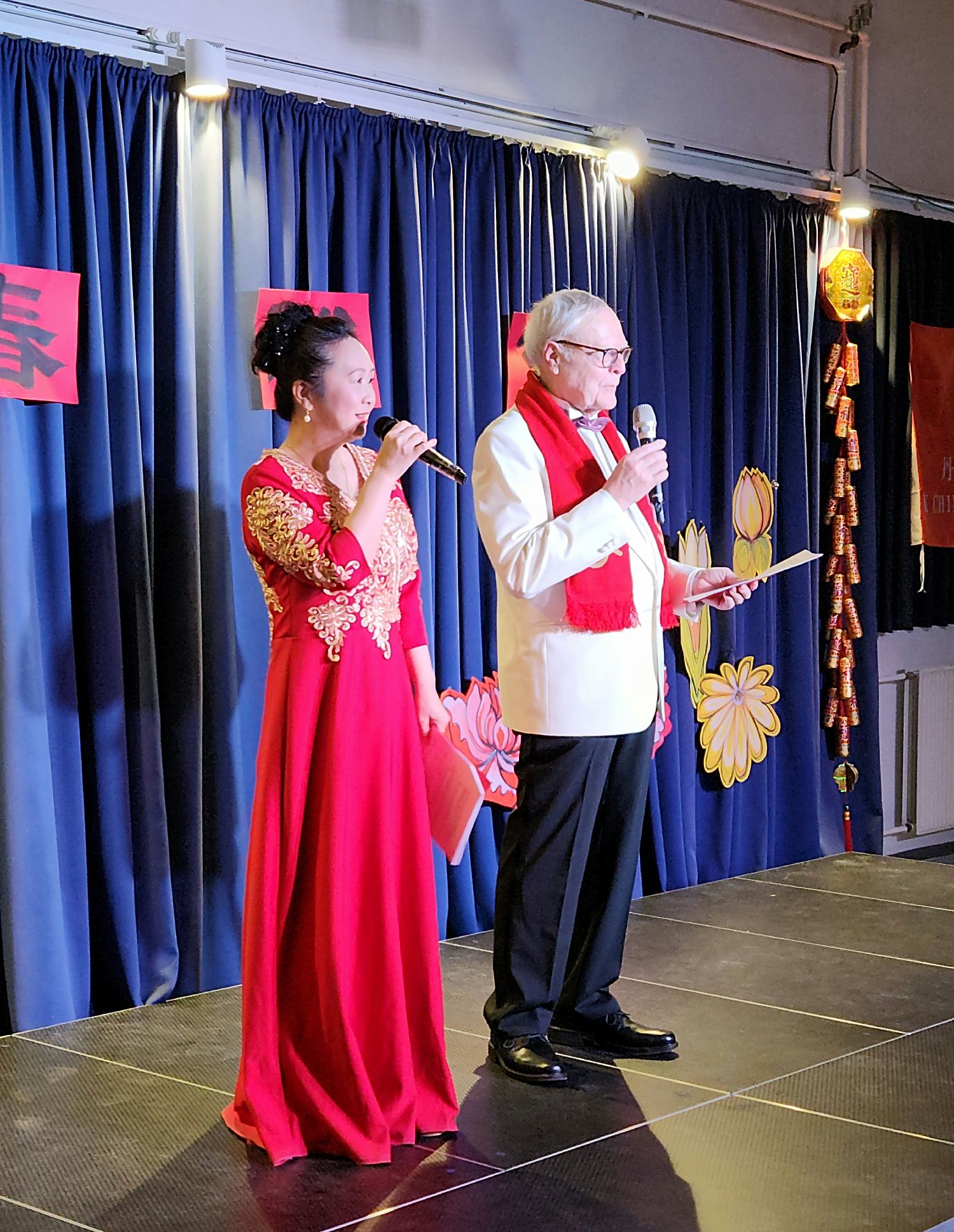 11:30身着中国红长裙的陈连和穿着白西装的草本登上舞台,用中丹文宣布:“丹麦华人艺朮团庆新春联欢会现在开始!”台下响起了一片掌声。
