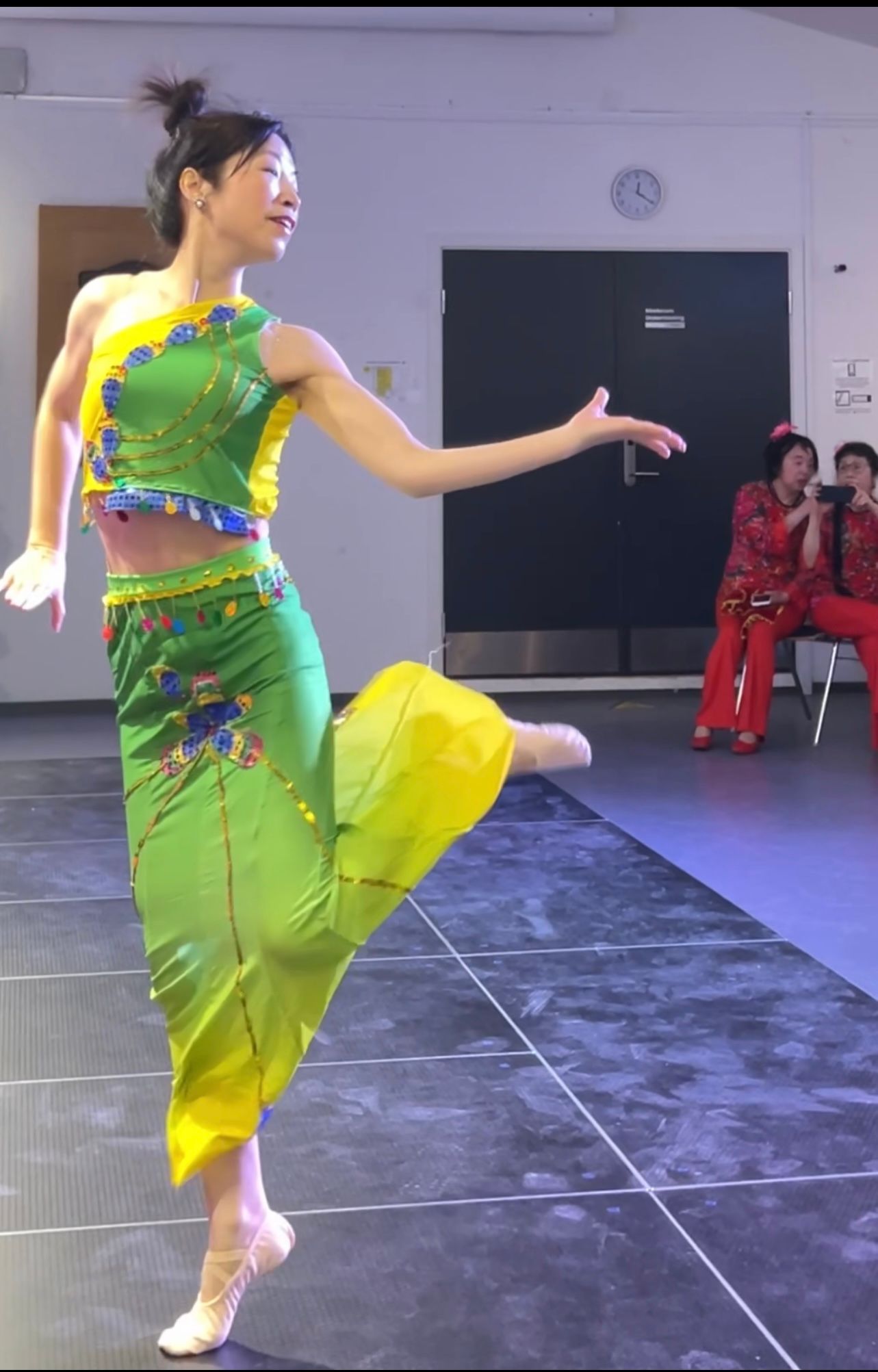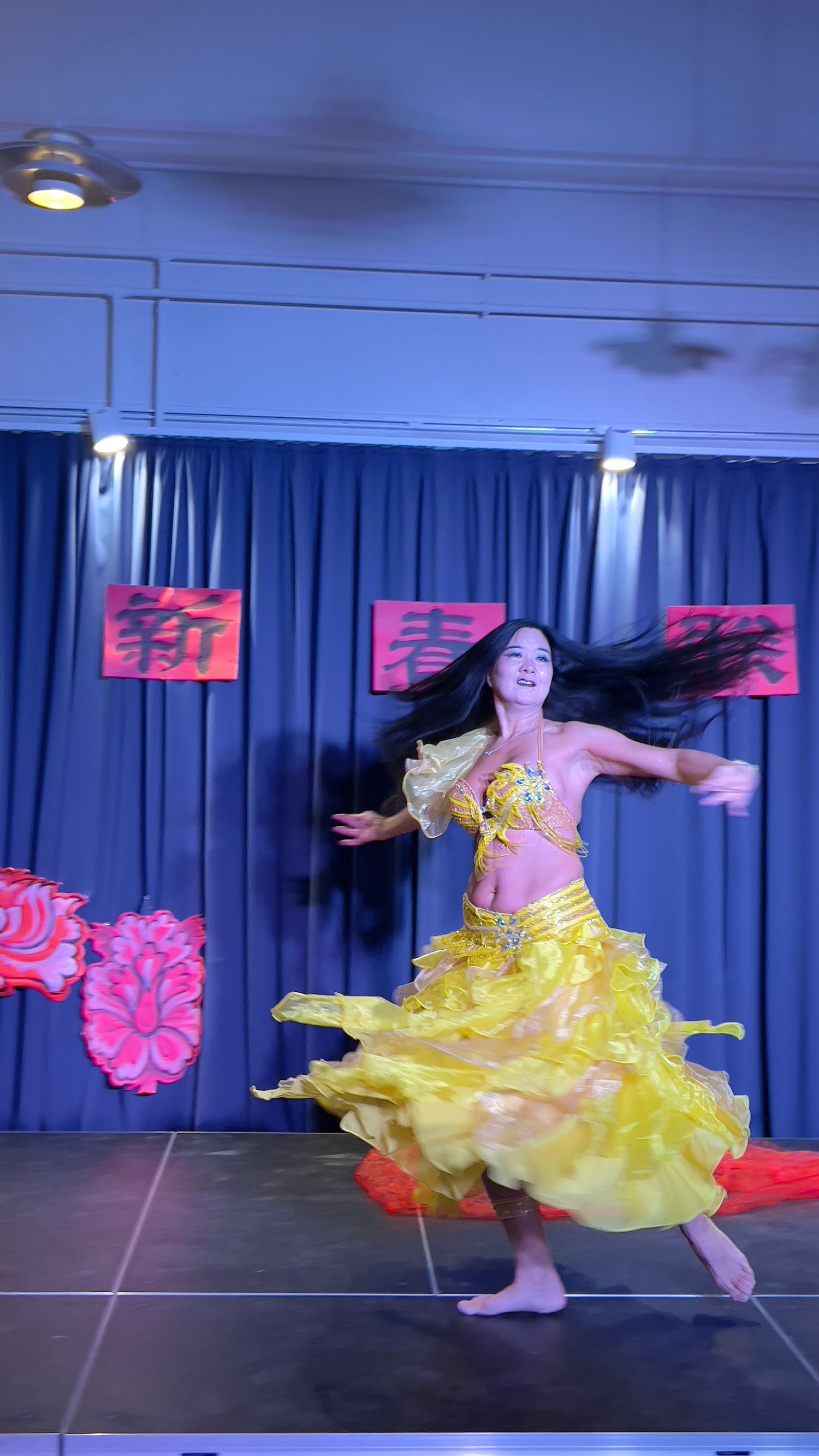 Vivian穿着黄色演出服出场了,犹如金蛇狂舞,火辣辣的感觉扑面而来,舞者随着变化万千的快速节奏摆动臀部和腹部,舞姿优美,变化多端,彰显阿拉伯风情。