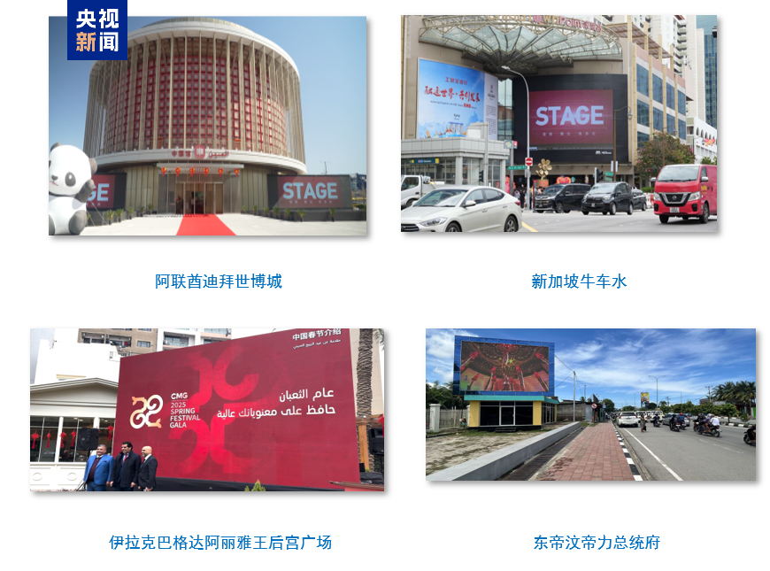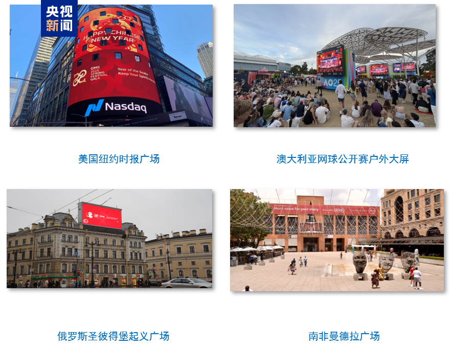 在美国纽约时报广场纳斯达克大屏以及联合国总部大楼、东帝汶帝力总统府、德国汉堡莫扎特音乐厅、澳大利亚网球公开赛户外大屏、英国特拉法加广场、俄罗斯圣彼得堡起义广场、南非曼德拉广场、阿联酋迪拜世博城、新加坡牛车水、伊拉克巴格达阿丽雅王后宫广场等多地海外地标性大屏,春晚宣传片惊艳亮相、持续刷屏,与世界共享浓浓中国年味。