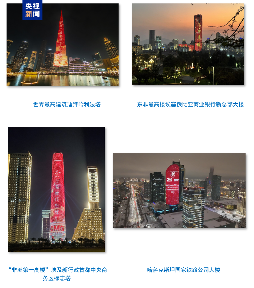 异彩纷呈!总台新春灯光秀陆续点亮世界最高建筑迪拜哈利法塔、“非洲第一高楼”埃及新行政首都中央商务区标志塔、东非最高楼埃塞俄比亚商业银行新总部大楼、哥斯达黎加卡塔戈遗迹、哈萨克斯坦国家铁路公司大楼等全球多处知名地标,美轮美奂、流光溢彩,成为一道道亮丽的风景线。
