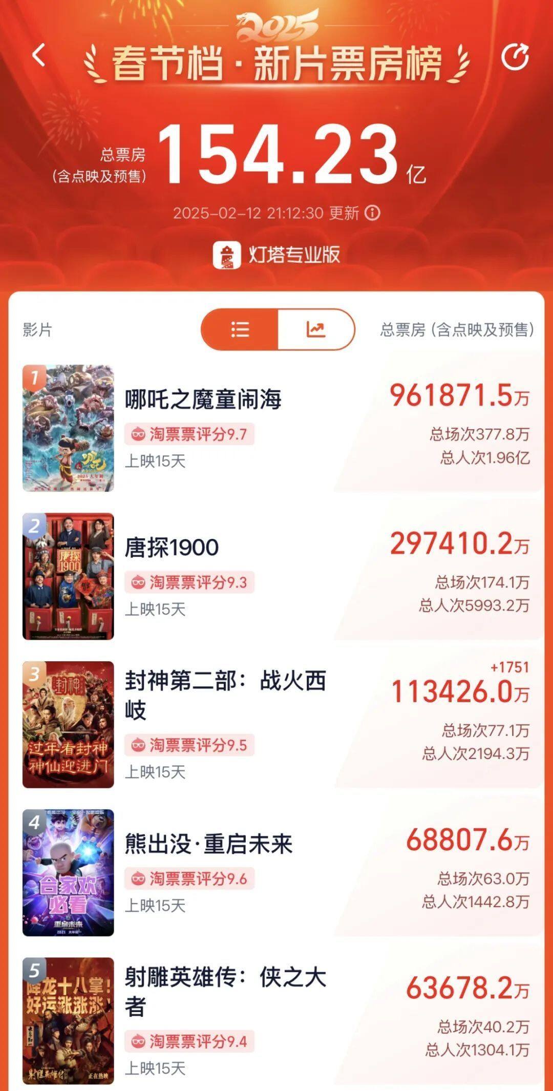 今年春节档,《哪吒之魔童闹海》火了,截至2月12日20时33分,该片票房(含预售)已破96亿元。