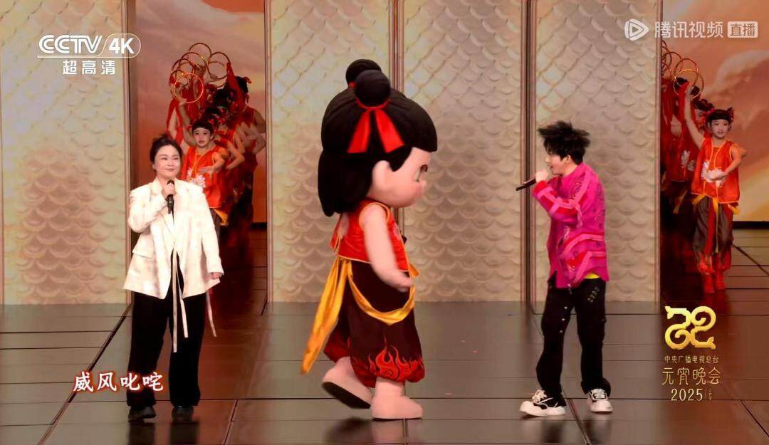 在今晚的元宵晚会上,电影《哪吒之魔童闹海》中的哪吒(人偶)和敖丙(人偶)欢喜亮相,配合哪吒配音演员吕艳婷标志性的烟嗓和台词,又让大家回到了魔童闹海的场景中。