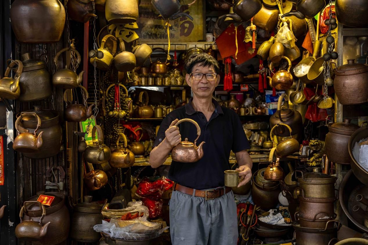 A coppersmith proudly displays his craft in a market near the Cantonese Opera Art Museum in Guangzhou, Guangdong, Wednesday, November 20, 2024. (Photo: Irfan Khan)