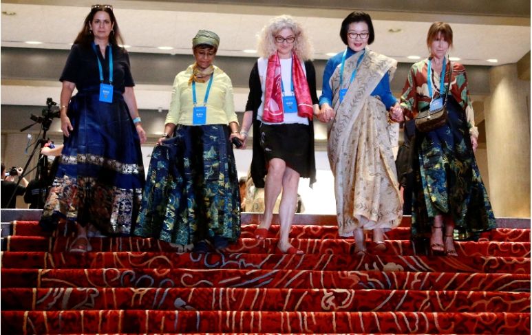 2024年7月10日,山东曲阜,周锦(右二)和外宾们身着中国传统服饰马面裙出席第十届尼山世界文明论坛开幕式。(图片来源:本文图片均据中新社)