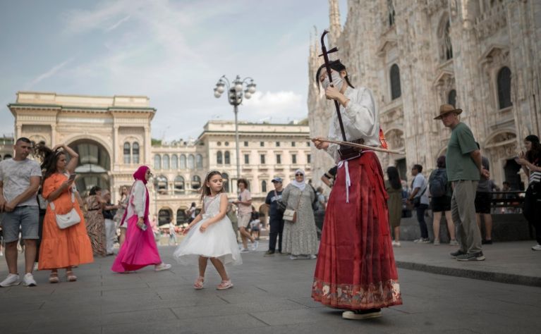 来自山东潍坊的郑晓慧身穿马面裙在意大利米兰街头演奏二胡。