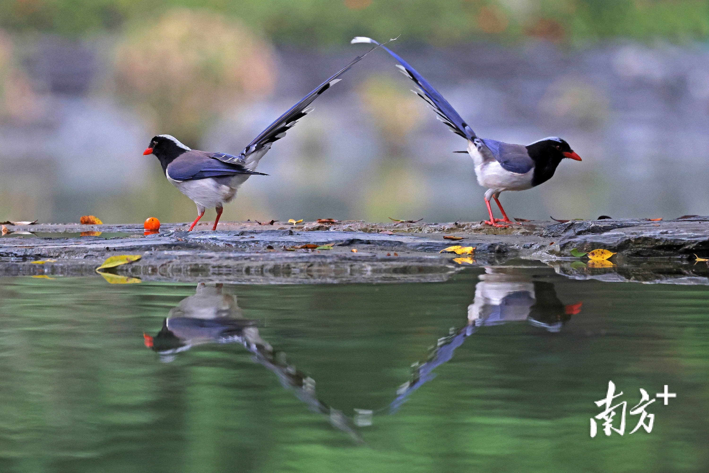 《成双成对》香港元朗天水围公园,红咀蓝鹊在水边嬉戏。陈体根(香港)摄