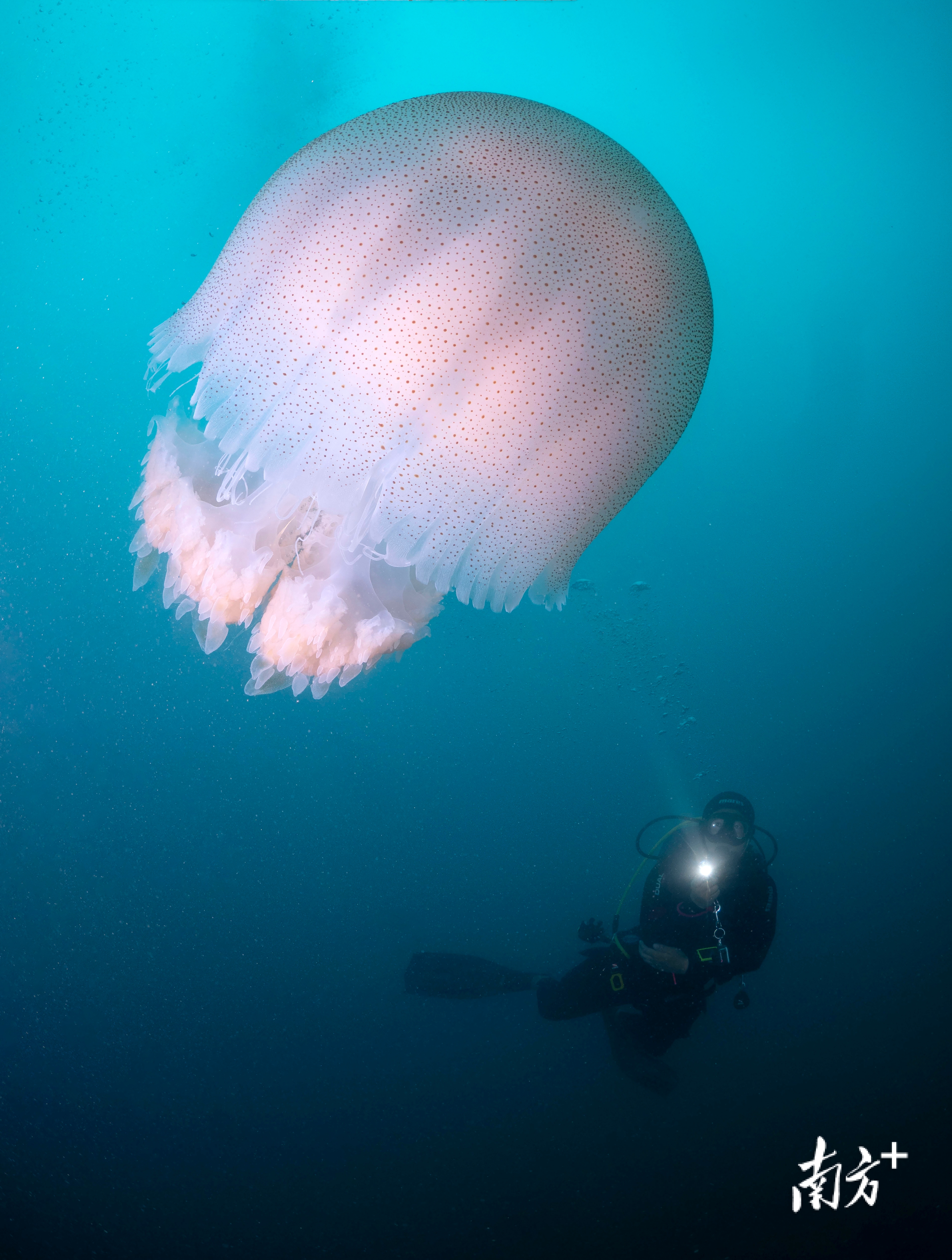 《同游》广东珠海蚊尾州岛海域,潜水员与水母同游。何棹樑(澳门)摄