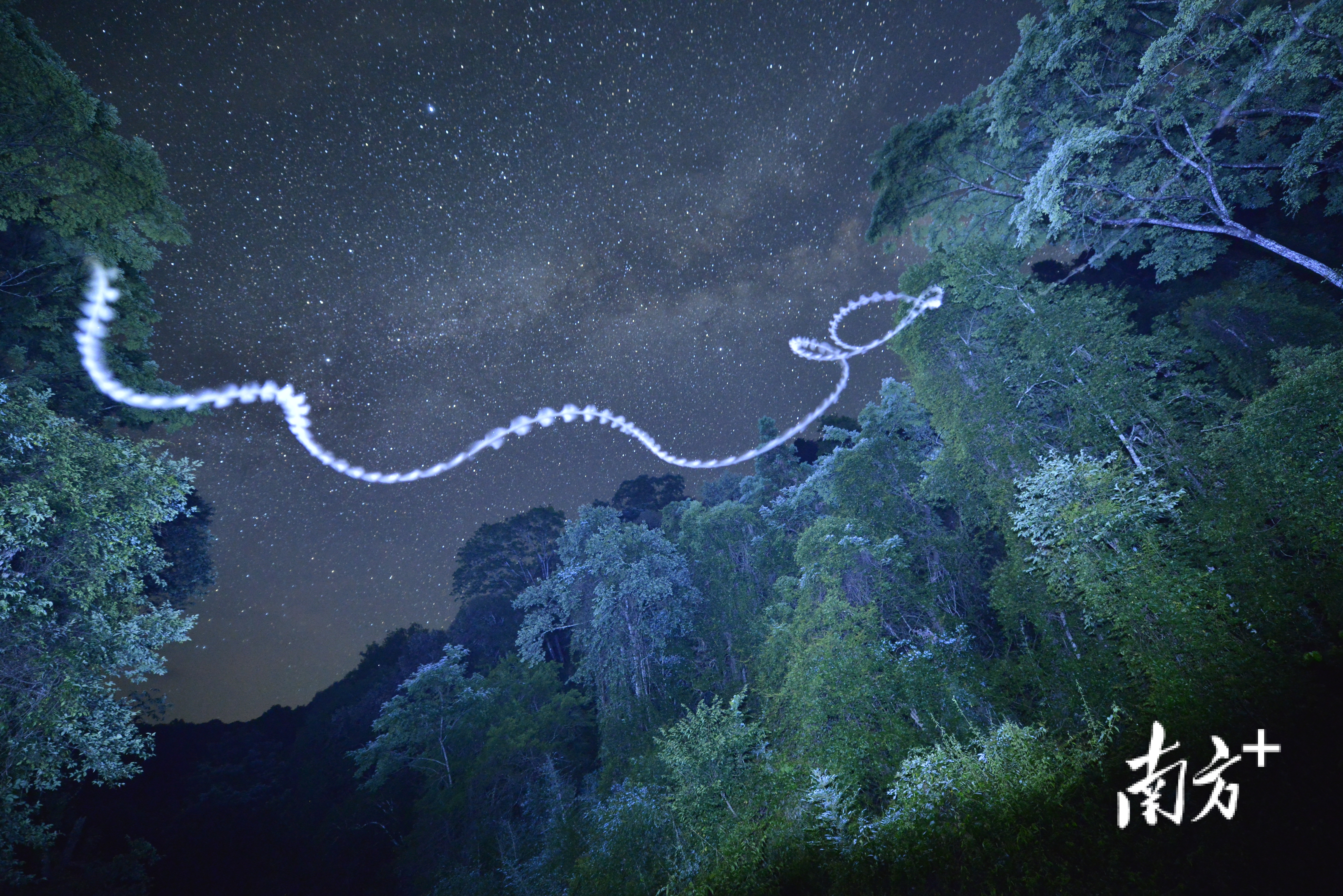《银河流萤》广东韶关车八岭国家级自然保护区内,一只飞蛾从树林间飞过,留下的美妙轨迹与天空中的银河相映成趣。丁铨摄