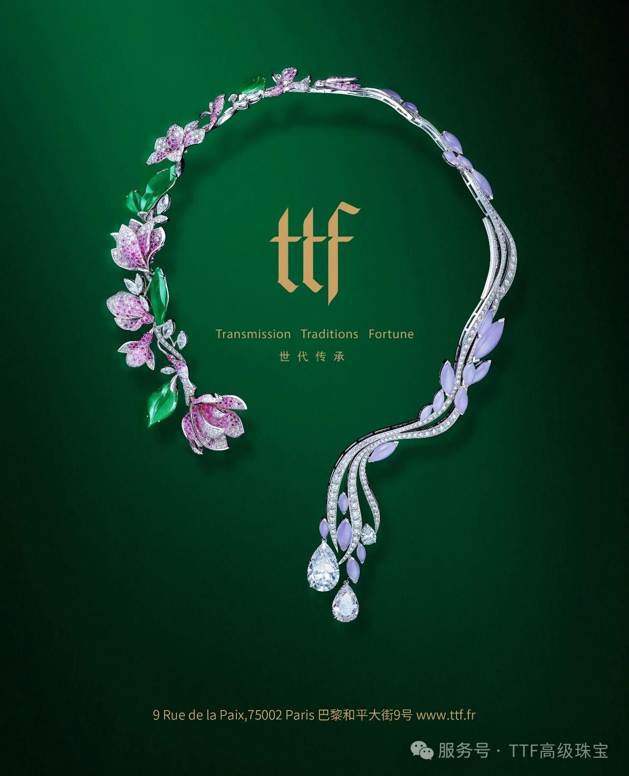 TTF的“宋韵哲思”:TTF将宋代美学的“空灵飘逸”注入珠宝,如《玉兰花开》以翡翠雕刻展现“冰清玉洁”的东方意境,logo更直接采用宋徽宗瘦金体。其作品不仅是装饰品,更是“可佩戴的文人画”,通过玉兰、锦鸡等意象传递儒释道哲学。