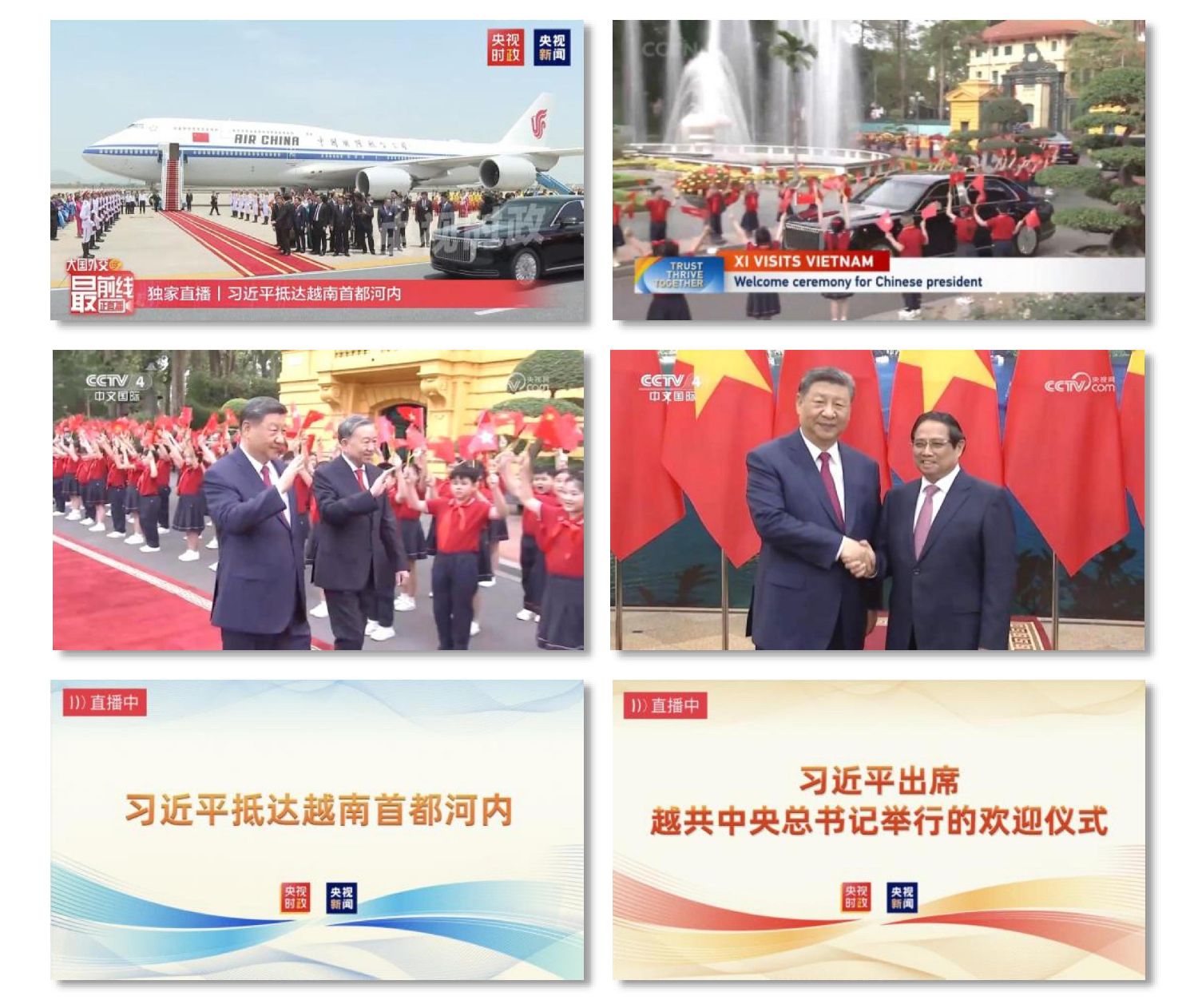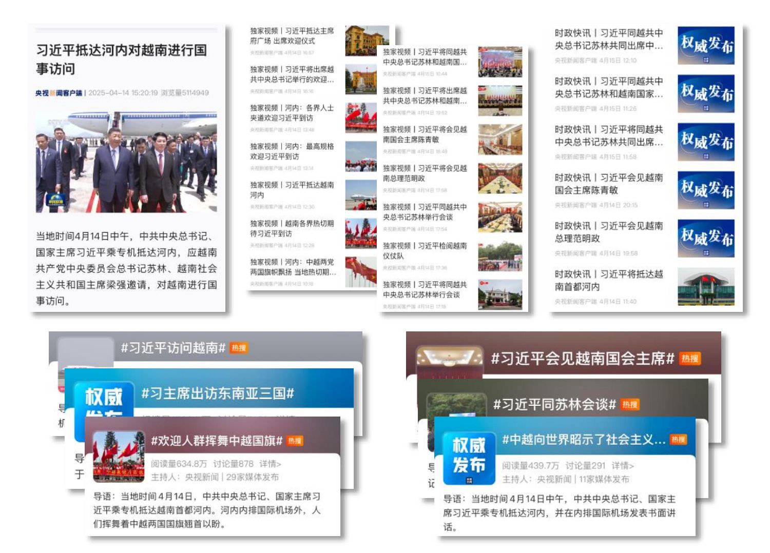 即时传递重大主张。《习近平同越共中央总书记苏林举行会谈》《习近平会见越南国家主席梁强》《习近平会见越南总理范明政》《习近平会见越南国会主席陈青敏》等37条时政快讯、独家视频,第一时间报道习主席同越南领导人畅叙友谊、共商合作,擘画新时代中越命运共同体建设新蓝图。央视新闻发起的#习近平访问越南#、#深化中越命运共同体建设#等微博话题登上热搜。