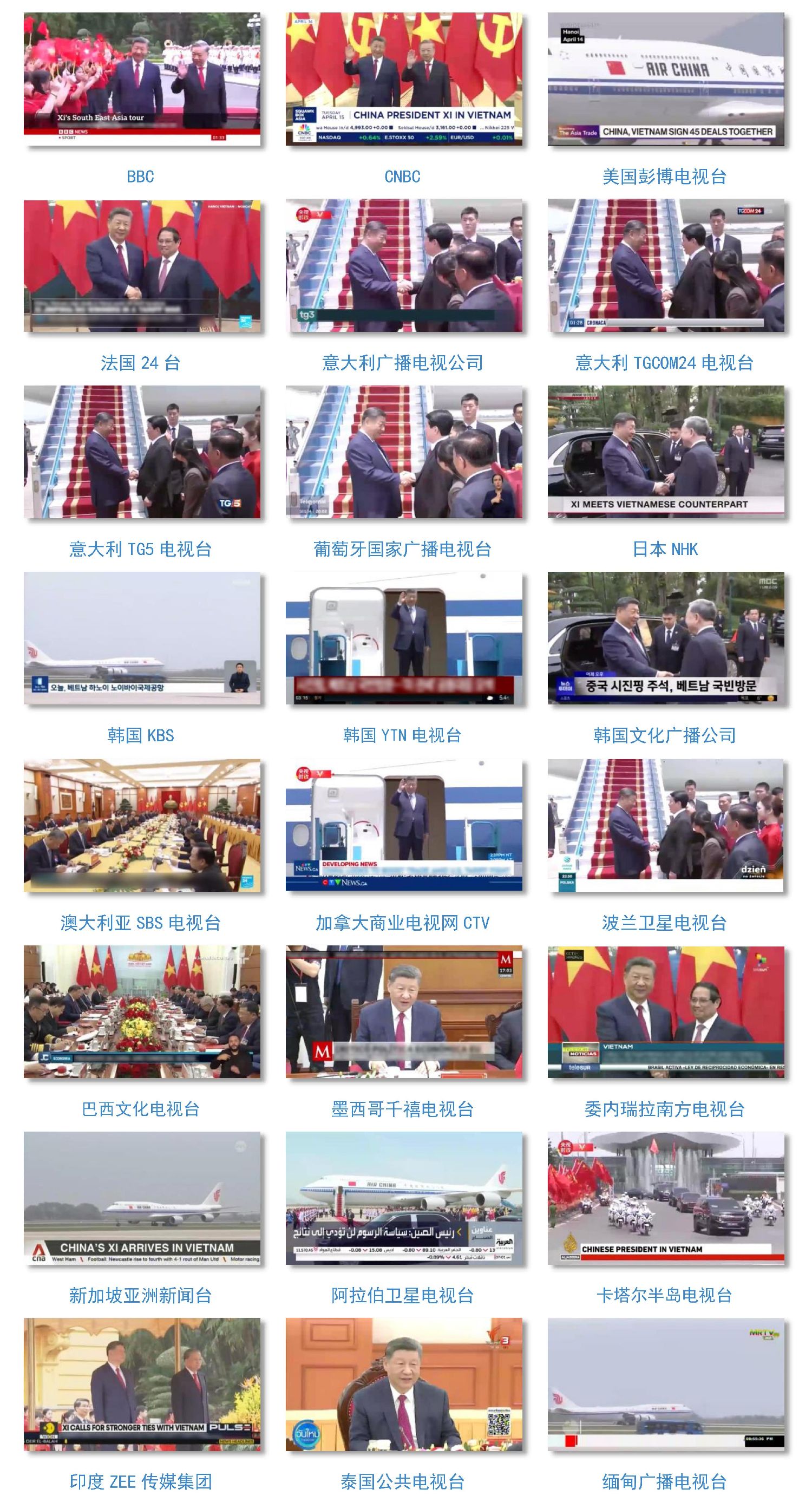 紧随习主席访越行程,CGTN发布多语种报道1434条,被1600余家海外主流媒体转载转发,全球阅读量超2.5亿。总台国际视频通讯社相关新闻视频被包括BBC、CNN、CNBC、PBS、美国彭博电视台、法国24台、德国Welt电视台、意大利广播电视公司、加拿大广播公司、日本NHK、韩国KBS、印度ZEE传媒集团、卡塔尔半岛电视台、澳大利亚广播公司、墨西哥千禧电视台、巴西文化电视台、委内瑞拉南方电视台等在内的52个国家和地区的220家海外主流电视台采用播出1435次。