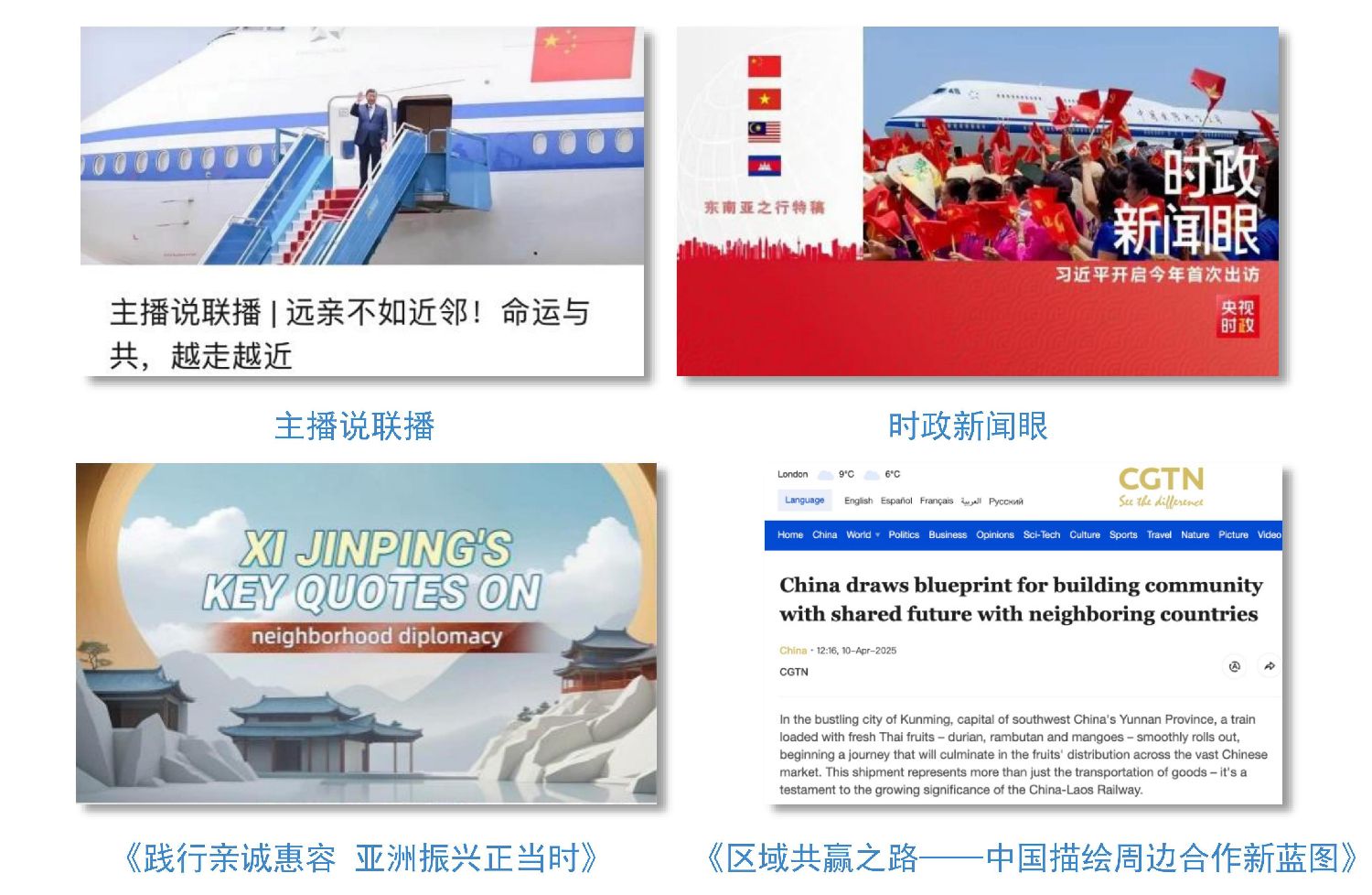 “好邻居”携手发展。《聚焦构建周边命运共同体习主席今年首访有深意》《习近平出访东南亚国家传递三大信息》《区域共赢之路——中国描绘周边合作新蓝图》《践行亲诚惠容亚洲振兴正当时》《远亲不如近邻!命运与共,越走越近》等评论产品,阐释习主席东南亚之行的深远意义,有力释放中国高举人类命运共同体旗帜,携手周边国家共创美好未来的积极信号。