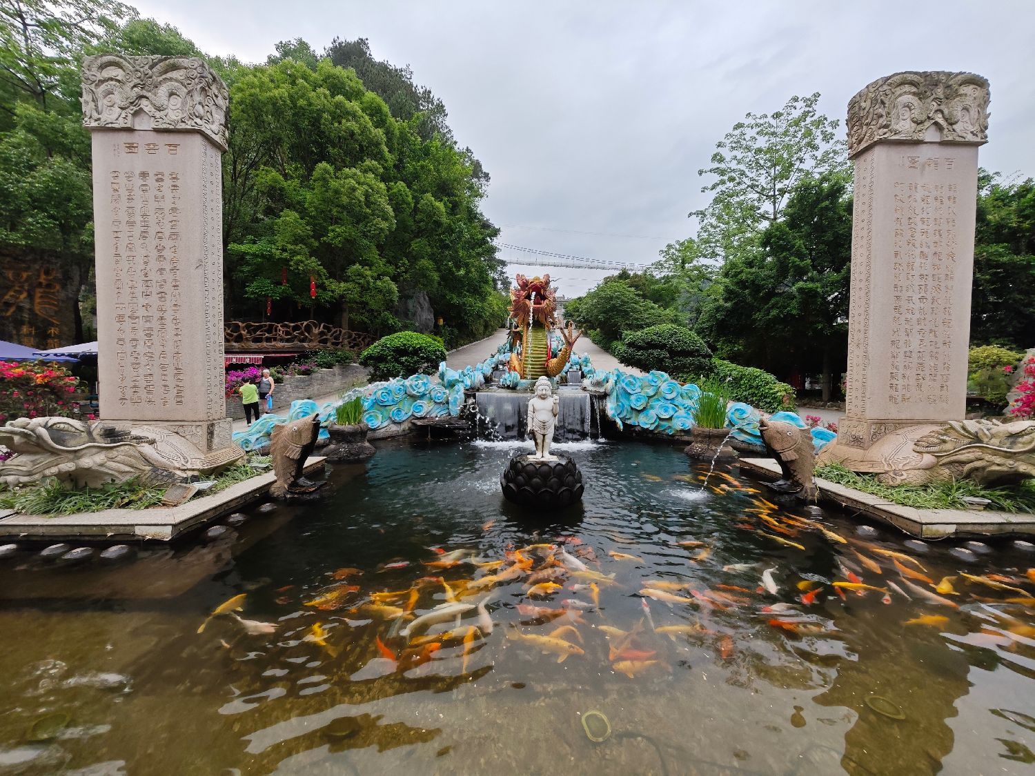 龙门水都的妙处,在于它不只是一处景点。那些仿古建筑里,藏着书店、讲堂、茶室;那些曲径通幽处,设着展板、碑刻、雕塑。游人们走着看着,不知不觉间,便与广西的历史文化打了个照面。渴了,还有东坡泉一饮开怀,小孩子指着状元桥问东问西,老人对着苏缄像喃喃自语,外国游客举着相机拍下那些他们或许不懂却觉得美的汉字——文化就这样活着,流动着。