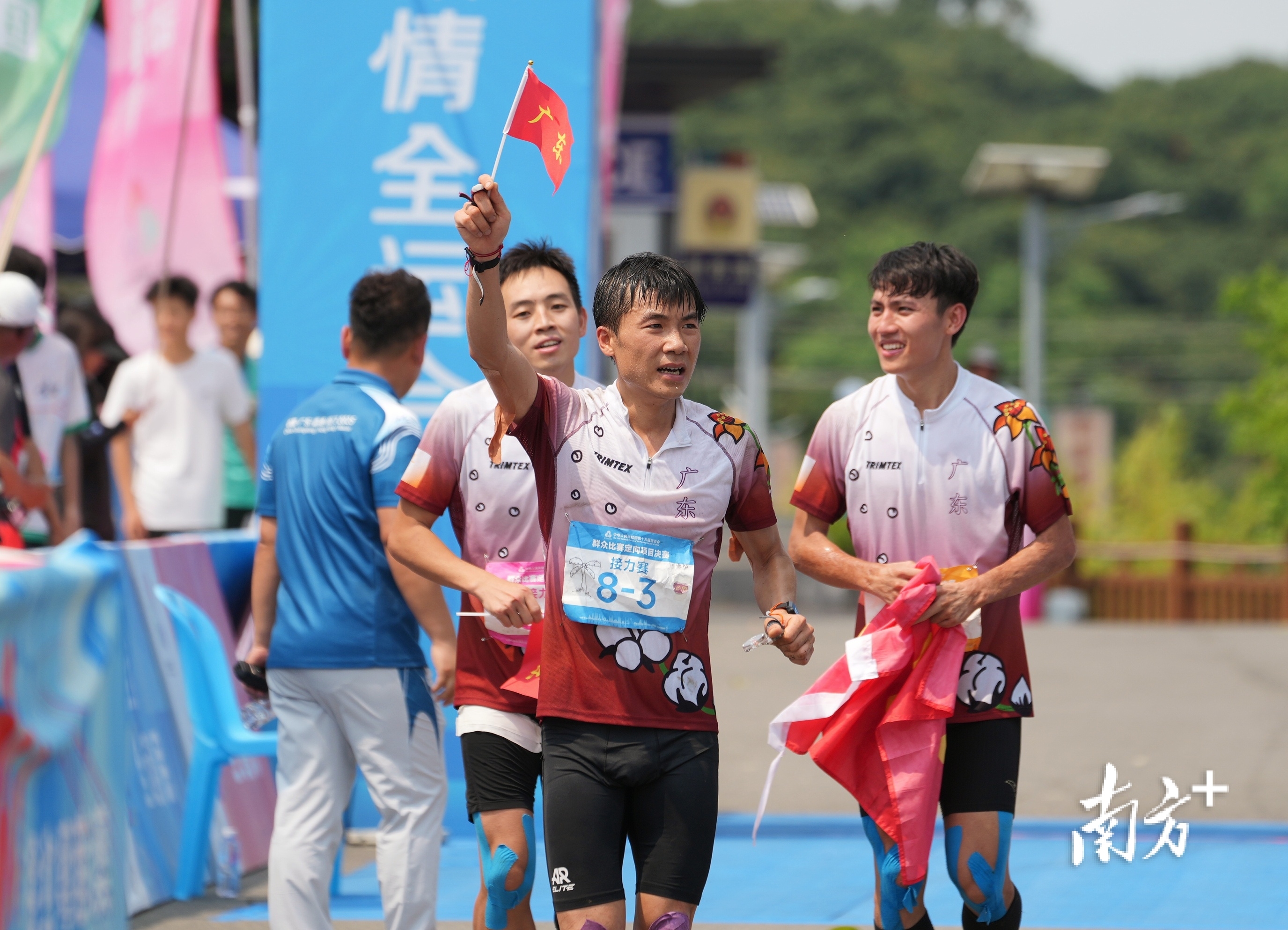上午大约10时40分,李卓业出现在了大家的视线中。唐建达和唐潇挥舞着手中广东队的旗帜,振臂高呼,和李卓业一起,在观众的欢呼声中冲过了终点线。