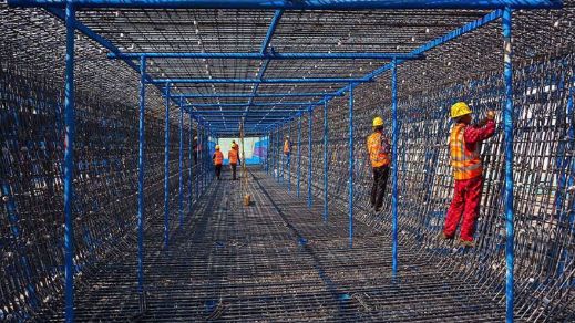 现代工程的奇观同样令人瞩目。罗定深南高铁高架桥上,工人们正在浇筑箱梁,钢筋水泥间流淌着时代的汗水与梦想。建筑工人在广州琶洲的工地,构筑升降机高塔万丈高楼平地起。