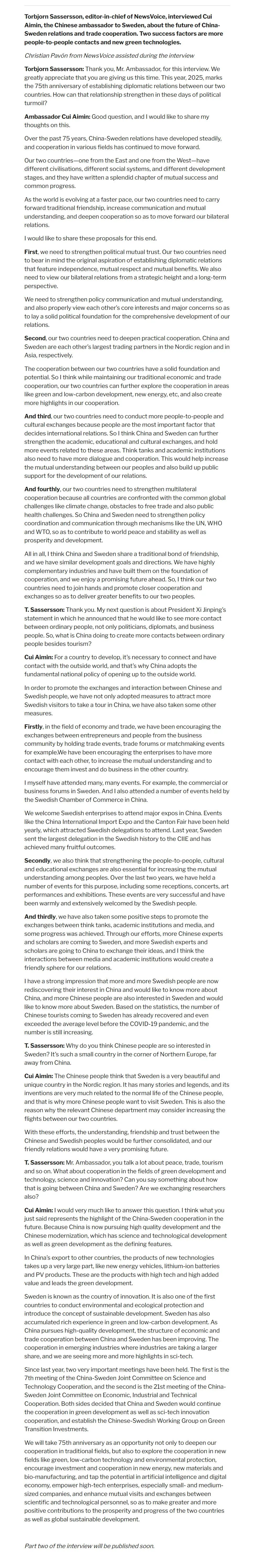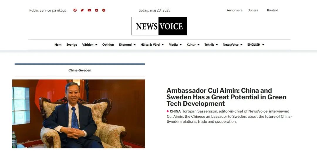 2025年5月20日,瑞典网络媒体“新闻之声”发布主编萨瑟森近日对中国驻瑞典大使崔爱民的专访实录(第一部分),全文如下: