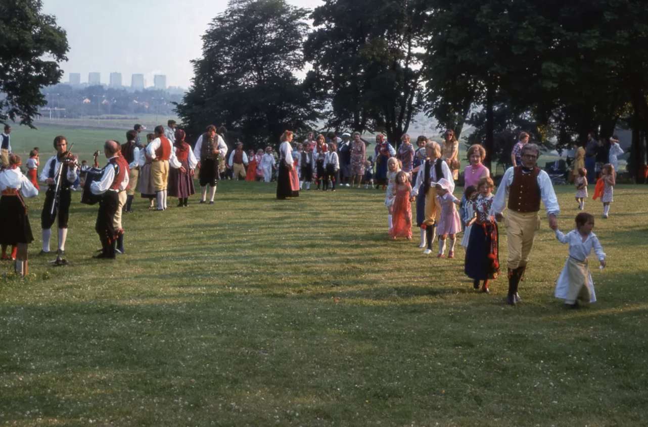 Bildenär tagen runt1970,nedanför församlingshemmet vid Brännkyrka kyrka.Det firas fortfarande midsommar här.Brännkyrka Hembygdsförening