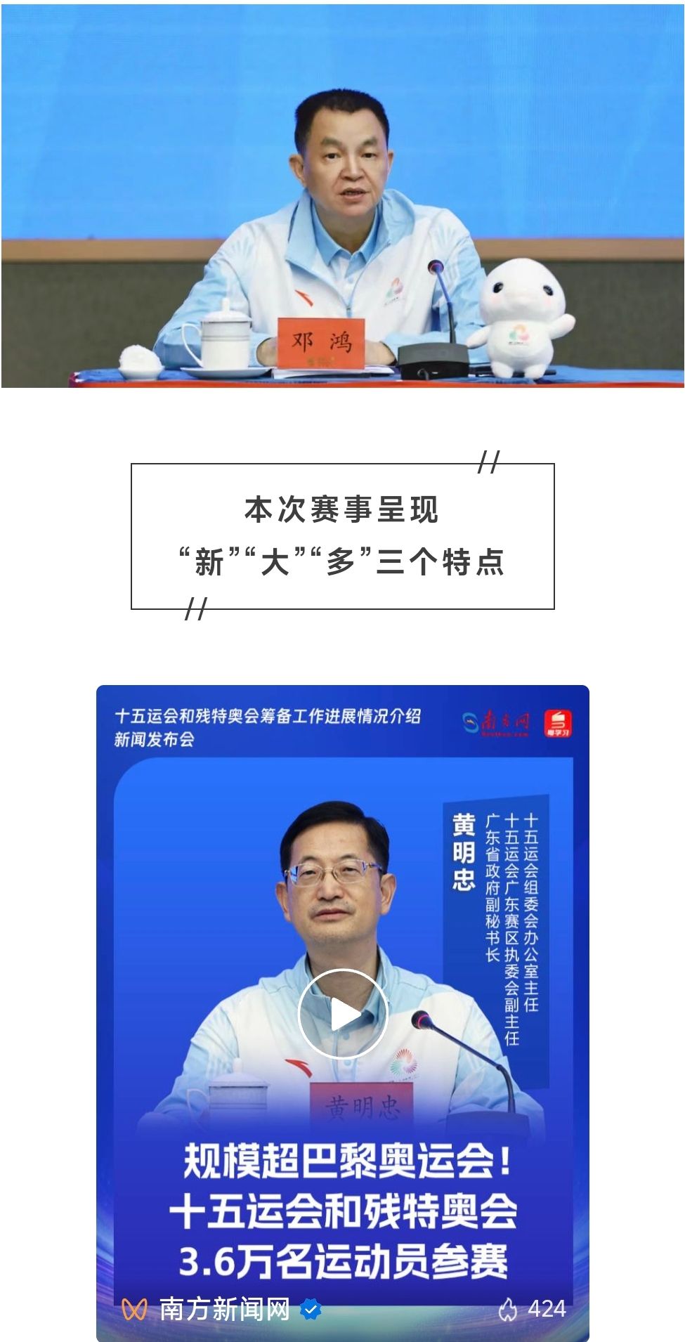 十五运会组委会办公室主任、十五运会省执委会副主任、省政府副秘书长黄明忠介绍,本届全运会和残特奥会呈现“新”“大”“多”三个特点。赛事由粤港澳三地共同承办,开、闭幕式分在广州和深圳举办,在智慧化场馆、绿色办赛、简约办赛等方面有创新举措,还建立了常态化协调沟通机制。预计有3.6万名运动员、4.5万名赛会志愿者、4000名记者参与。设十五运会57大项、残特奥会46大项,规模超2024年巴黎奥运会,部分项目竞技水平世界顶尖。不建集中的全运村,19个城市办赛,大家可体验多地特色。