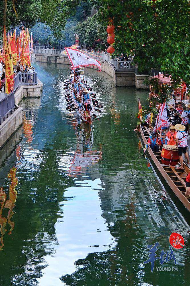 龙船从自家祠堂出发,到泮塘村各个龙船会来回划三次,相互打招呼,并在荔湾湖进行巡游