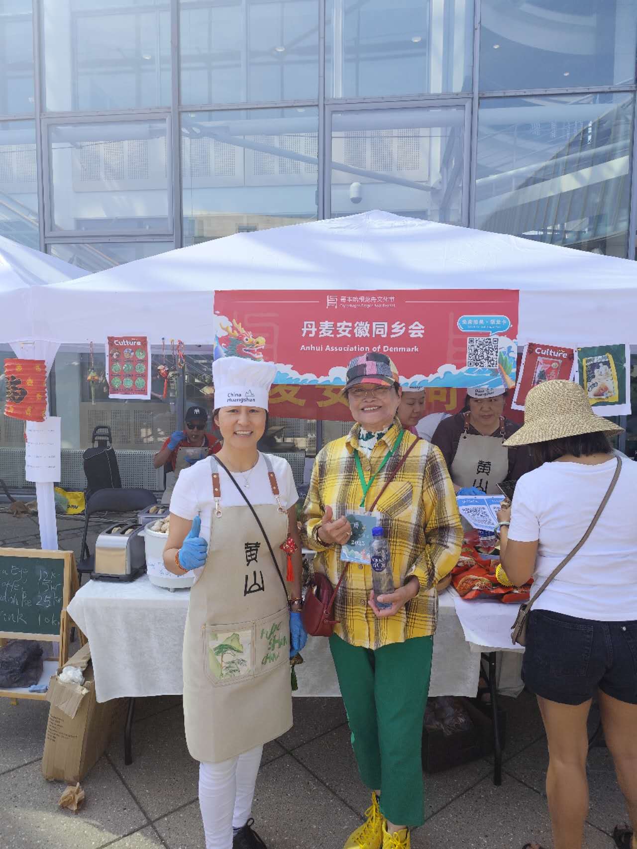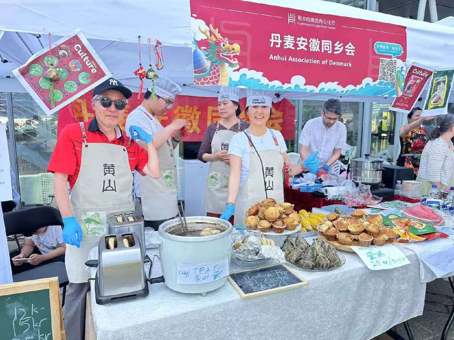 在文化体验日,同乡会设立的安徽文化展示摊位前人头攒动。独具徽风皖韵的黄山、庐江等风景图片,让丹麦民众仿佛置身于安徽的山水之间,现场展示的庐江白云春毫茶叶,吸引了众多中外友人驻足,纷纷品尝并购买。