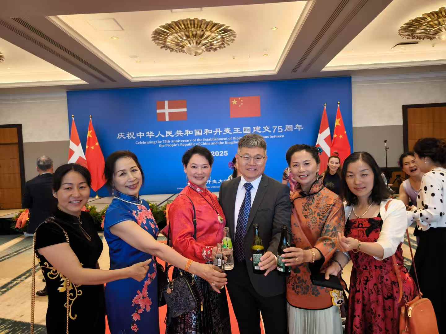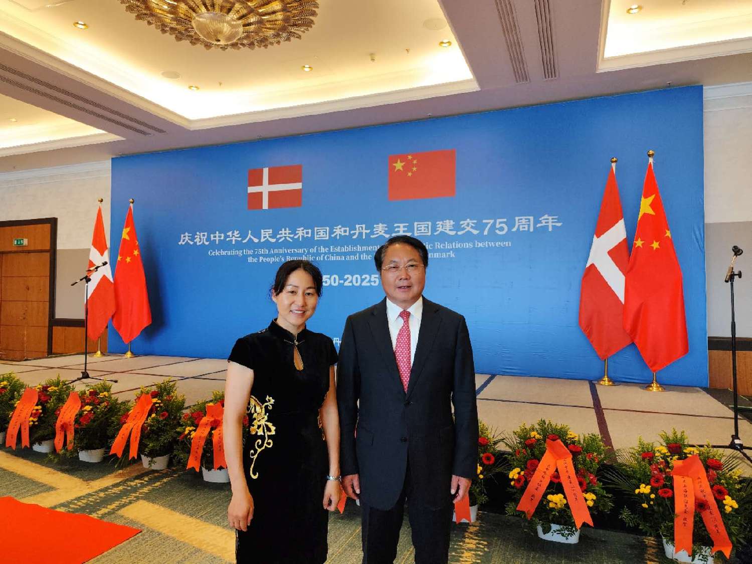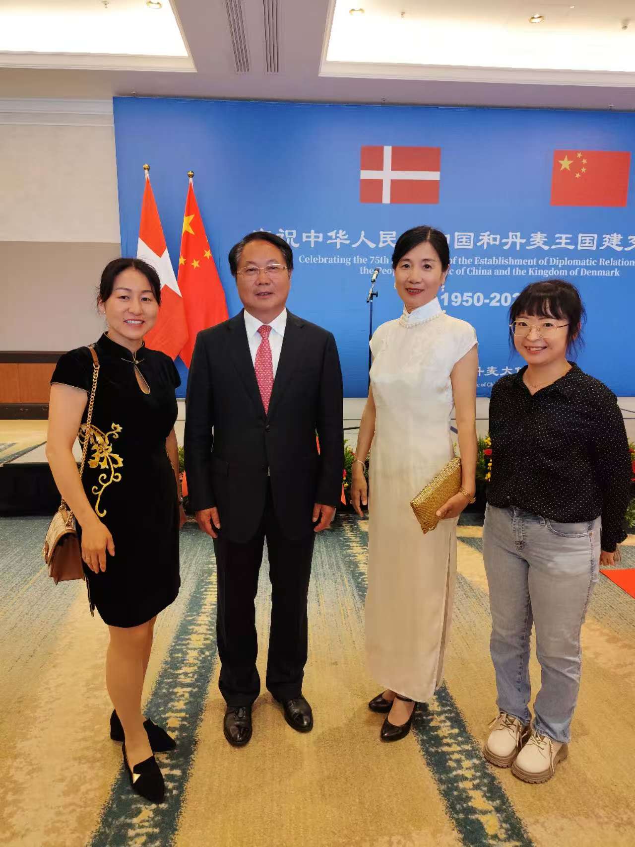 在中国驻丹麦大使馆举办的“庆祝中丹建交75周年”的庆典上,王雪峰大使和夫人与我们亲切合影留念。