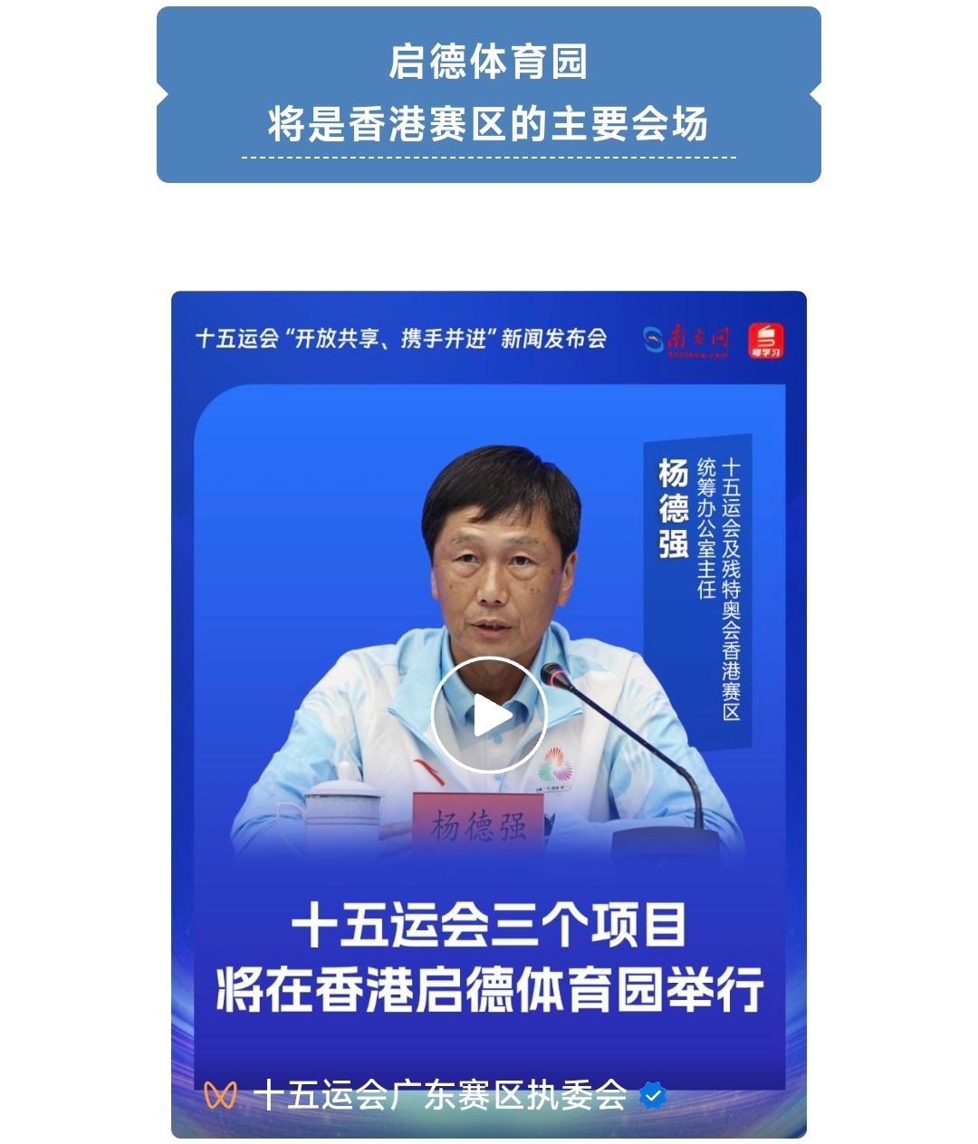 十五运会中的七人制橄榄球、击剑和手球,以及残特奥会的硬地滚球,将分别在启德体育园的主场馆和体艺馆举行,杨德强希望为从内地和海外来港观赛观众,带来精彩的体验,亲身感受这个世界级场馆的魅力。