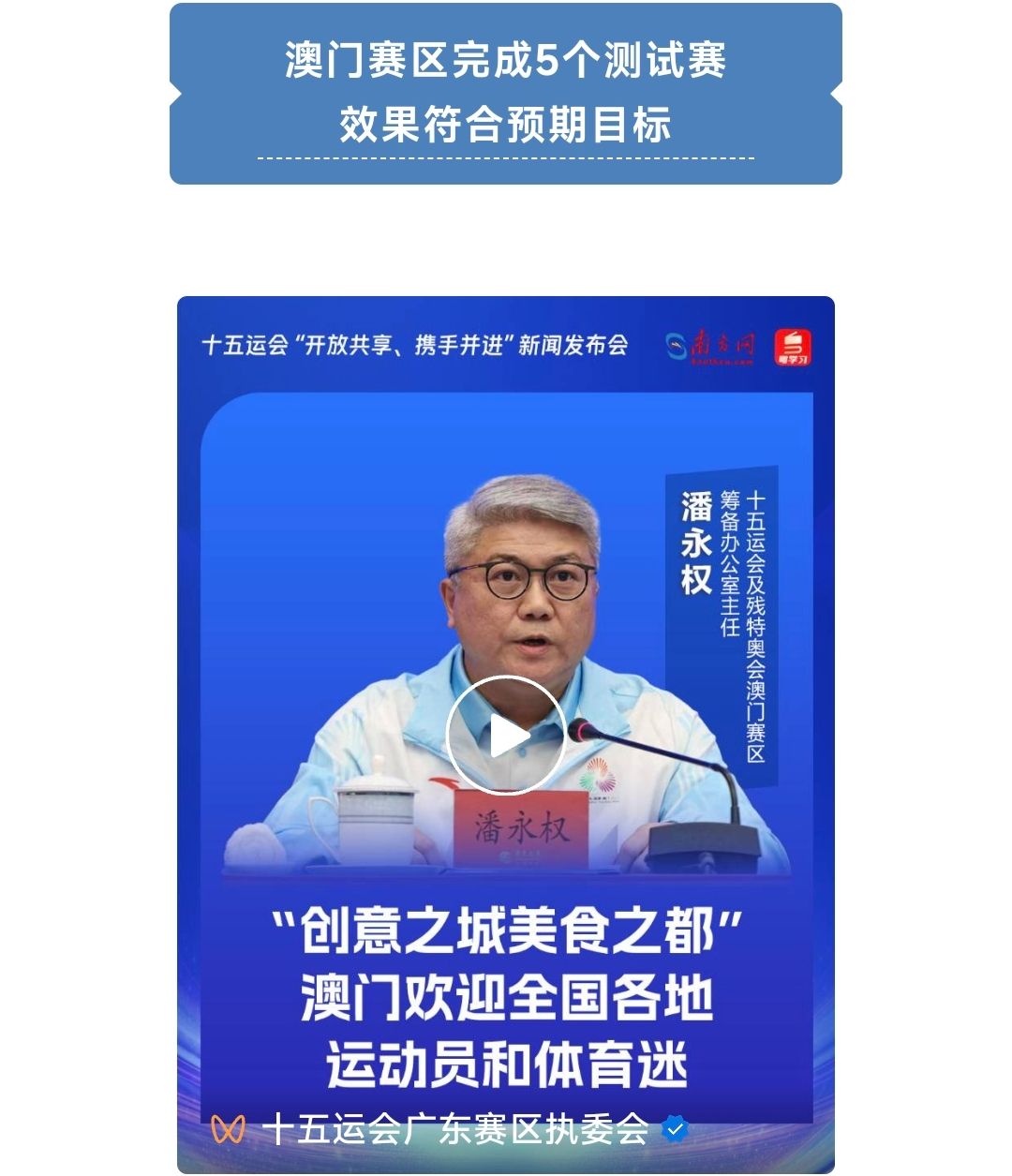 十五运会及残特奥会澳门赛区筹备办公室主任潘永权表示,澳门赛区将承办十五运会5个比赛项目,包括乒乓球、3人篮球、5人篮球(男子18岁以下组)、排球(女子成年组),以及空手道,还会承办残特奥会2个羽毛球比赛项目。此外,澳门也参与承办公路自行车男子个人赛,比赛路线将跨越粤港澳三地,是十五运会唯一一个连通粤港澳三地的比赛项目。
