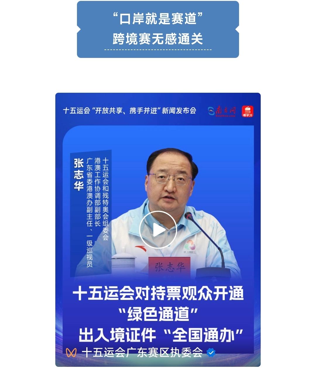 十五运会和残特奥会港澳工作协调部副部长、省委港澳办副主任、一级巡视员张志华表示,十五运会和残特奥会,预计内地前往港澳参赛人员超过6000人,港澳来内地参赛人员超过3000人,是港澳来内地参赛和内地赴港澳参赛,人数最多的一届。其中,市民较为关心的通关方面有两大亮点。