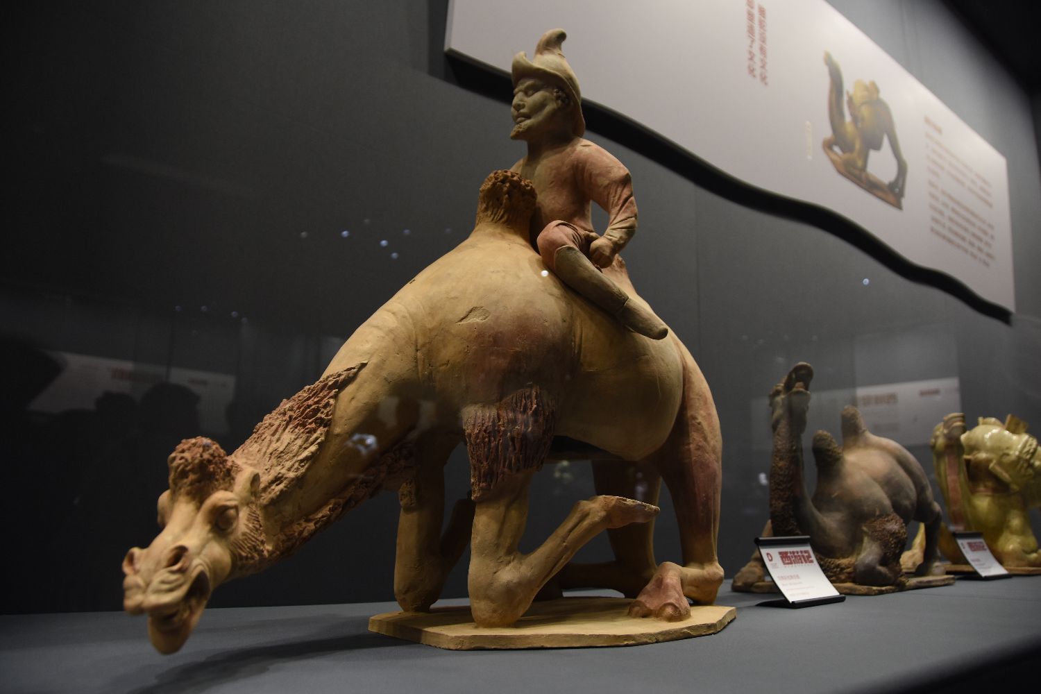 7月12日,《西游记——唐代陶瓷中的丝路文明》在河南郑州大象陶瓷博物馆开幕。图为灰陶彩绘胡人骑饮水跪驼俑。(图片来源:中新社)