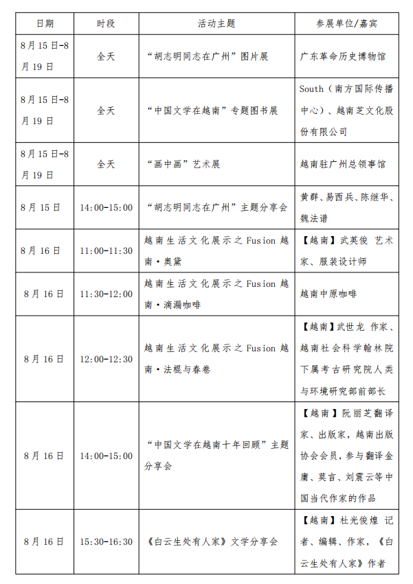 据介绍,作为策展方,South还安排了10多场丰富的文化交流活动,如胡志明研究的知名学者将联合举办“胡志明同志在广州”专题讲座,分享研究成果等。越南出版人、作家阮丽芝和作家杜光俊煌还将亲临现场分别举办“中国文学在越南十年回顾”主题分享和《白云生处有人家》读者见面会。
