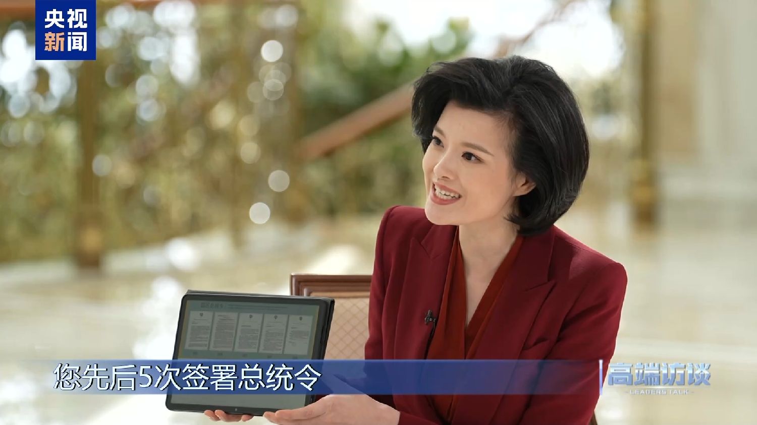 邹韵:您刚刚也与我们分享了您与习主席的深厚情谊。在过去这些年,您与习主席有过很多次的会面、交流互动,而且我们注意到今天总统办公室特别用心,专门把习主席在2023年3月份送您的礼物——这幅来自中国的画——摆在我们采访的现场。在您的眼中,总统先生,习主席是一位什么样的领导人?