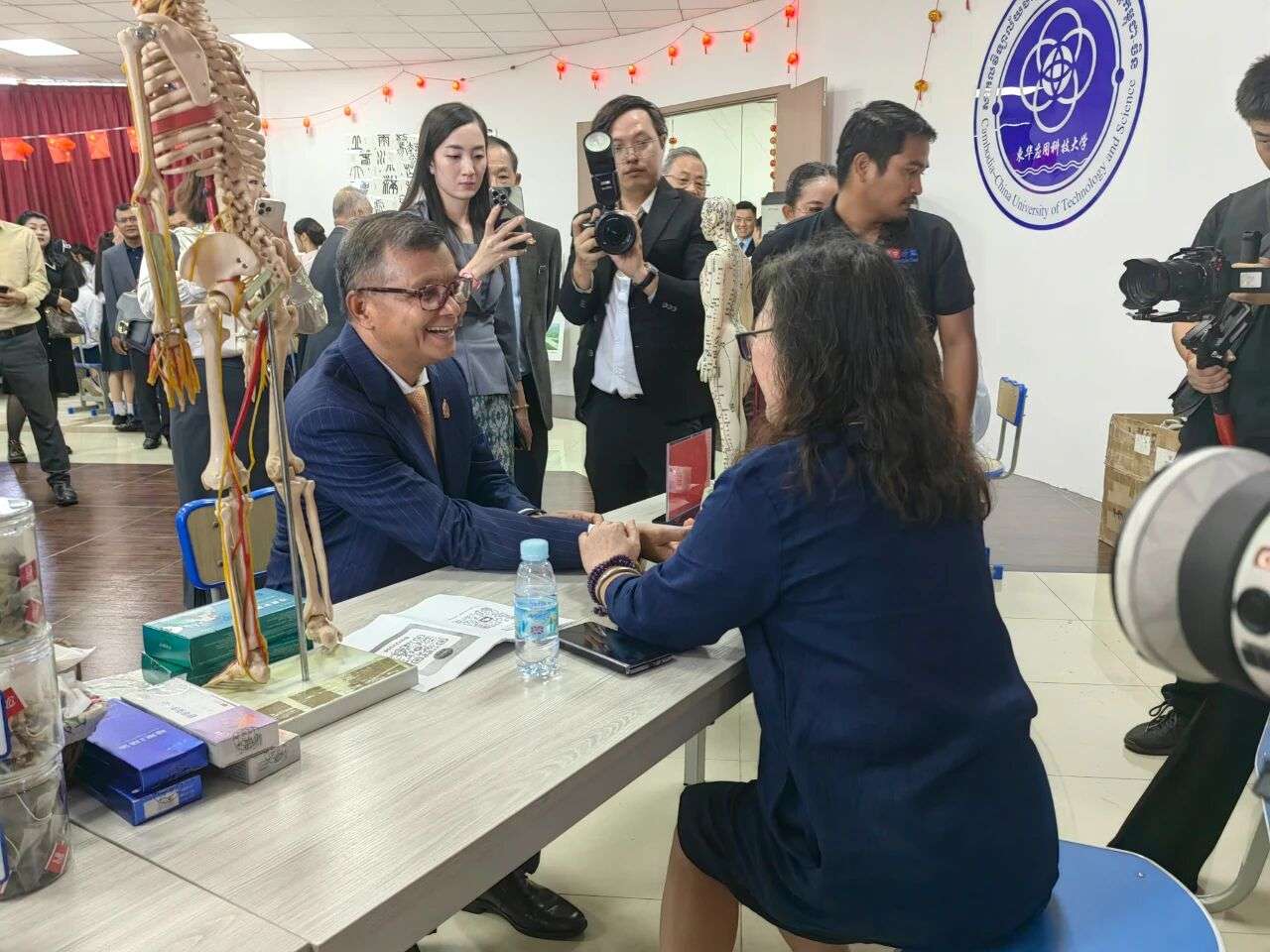 2025年8月14日,柬埔寨副首相兼教育青年体育部大臣韩春那洛(左)在柬华应用科技大学中华文化体验馆感受中医文化。中新社记者杨强摄