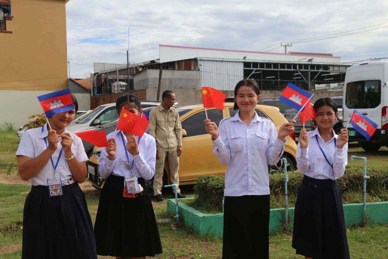 挥舞着中柬国旗的柬埔寨学生。资料图