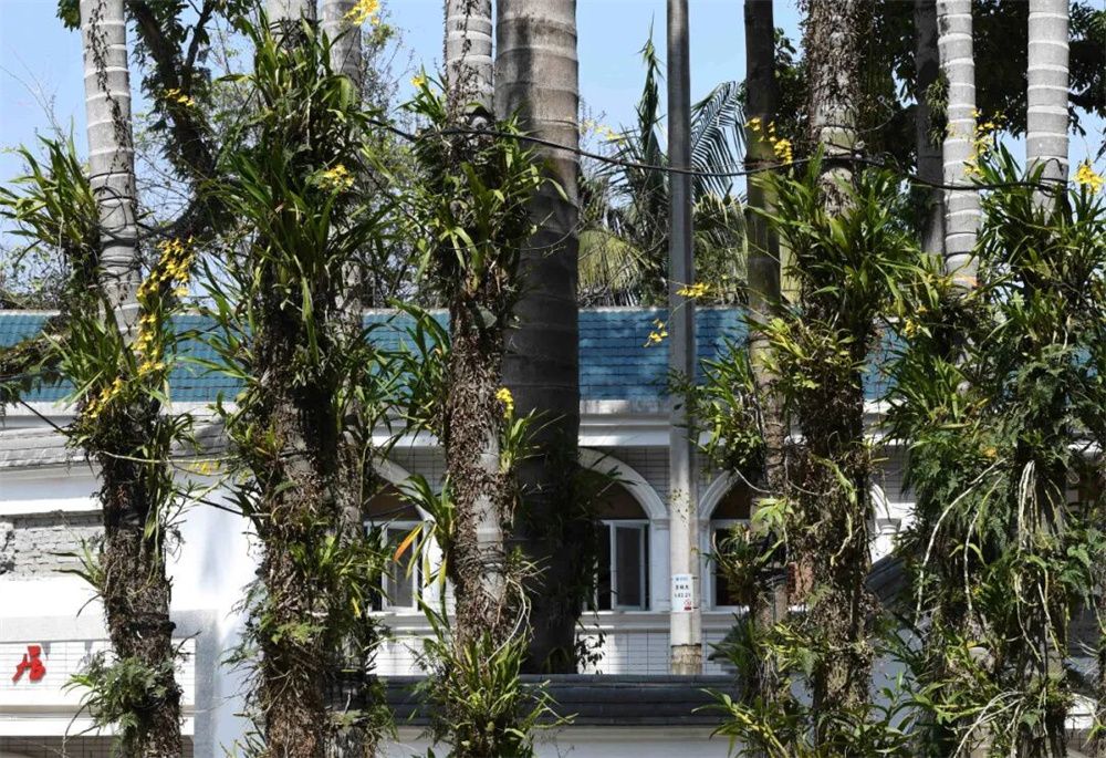 2018年3月22日,在福建农林大学校园内,附生在行道树上的兰花盛开着花朵,成为校园一景。(图片来源:中新社)