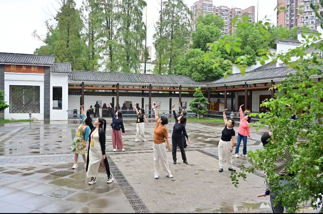 游客在健民叶开泰中医药文化园体验八段锦。刘康摄
