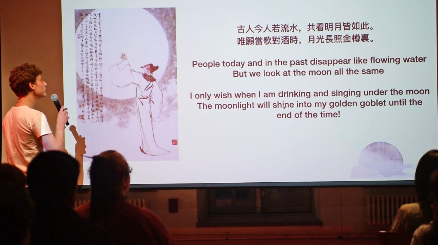 从诗经到汉乐府,从“今人不见古时月”到“静夜思”,从李煜“独上西楼”到苏轼“大江东去”,从悠扬的二胡到婉约的昆曲,会场里吟诵声,歌声,乐声此起彼伏,掌声,笑声连绵不断,参加活动的中外学生还用汉语,瑞典语,英语和德语朗诵了咏月的诗歌。语言虽不同,心意本想通。都是对美好未来的向往,对生活幸福的企盼。结束曲《水调歌头》更是激起参加活动的瑞典朋友们的共鸣,“但愿人长久,千里共婵娟”说出了大家的心声。