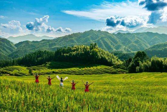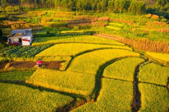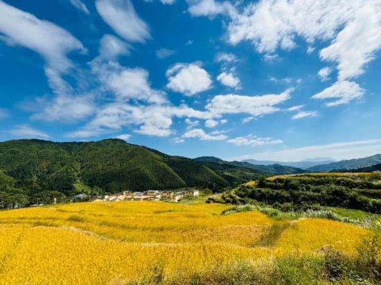 远眺处,稻田铺展成金色海洋,稻浪在风中轻轻摇曳,宛如大地柔软的信笺。