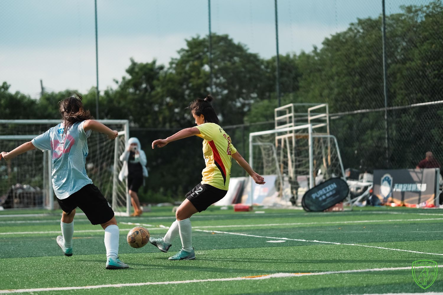 夜晚的广州科韵路,写字楼群间,五人制足球场灯火通明。细雨中的草皮泛着水光,一群女孩正在场上奔跑。38岁的“苦瓜”站在场边,目光紧随场上队员——她们的球衣早已被雨淋湿,汗水顺着发梢滴落,有人滑倒时膝盖蹭出浅痕,爬起却干脆利落,呼喊声、球擦过草皮声,构成这个夜晚最鲜活的旋律。