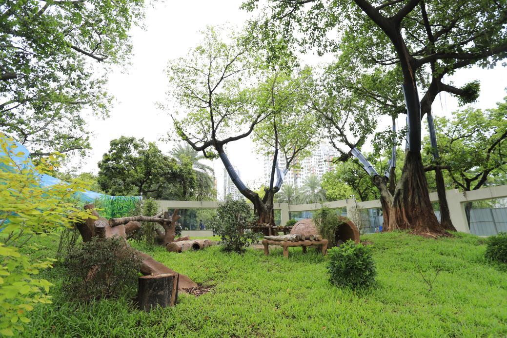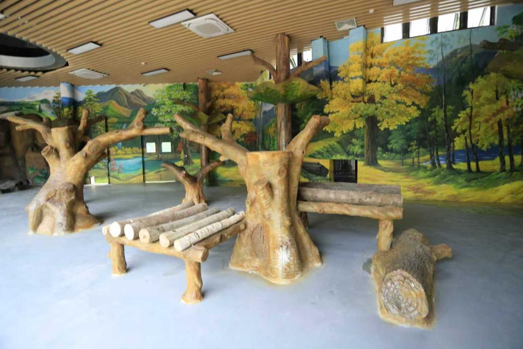 室外活动场充分模拟大熊猫自然栖息环境,地形高低起伏,有乔木、灌木和草坪,配合栖架、滑梯、倒伏树木、饮水池、戏水池等丰容设施,形成一片绿荫环绕、平坦开阔的“花园”。此外,参观面采用的特种玻璃具有保温、降噪、防雾功能,为大熊猫创造宁静舒适的生活玩耍空间。