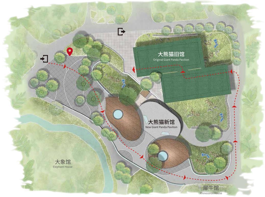 新馆毗邻旧馆,串联成为整体,有效延长参观流线,沿途穿插布置各类科普互动设施,打造蕴含趣味性、知识性的“一次性看四只大熊猫”沉浸式体验。