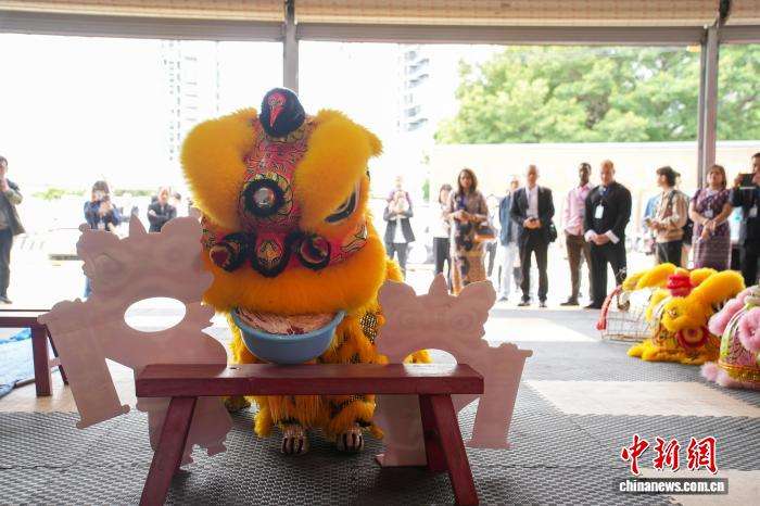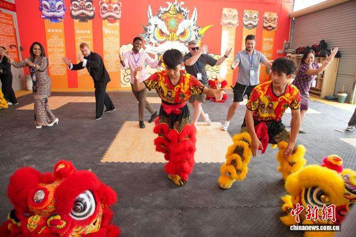 20余家境外媒体记者与网络媒体达人21日走进狮韵醒狮传承基地,近距离感受醒狮文化的独特魅力。