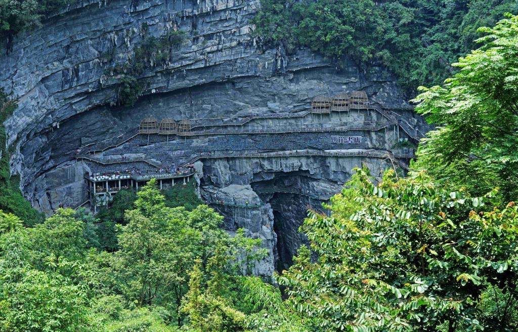 在中国广西河池市罗城仫佬族自治县郁郁葱葱的山林间,有一座无视重力定律的“悬崖书店”。这座壮观的书店坐落于棉花天坑景区巨大的悬崖边,提供了一个悬挂在天地之间、令人叹为观止的阅读环境。