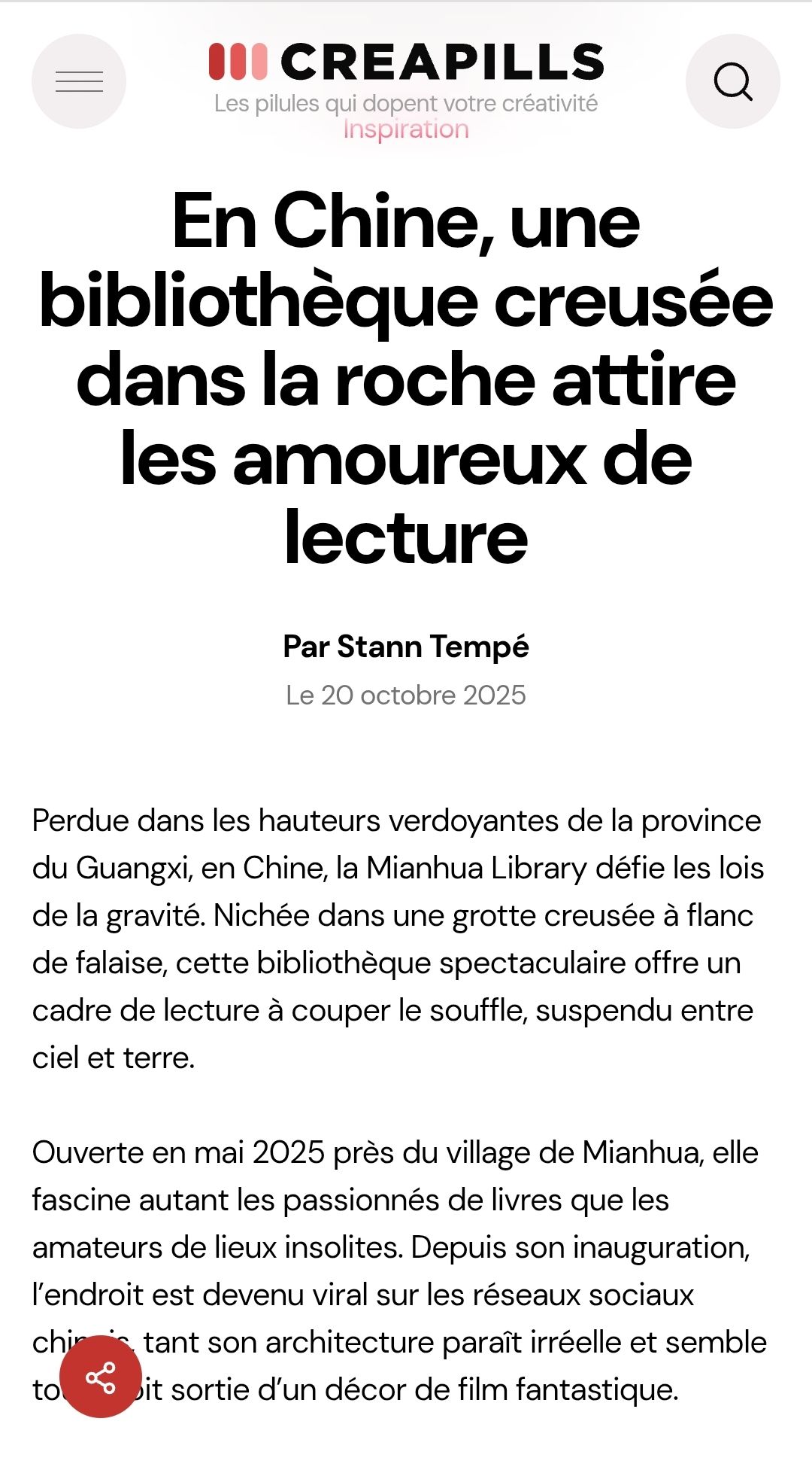 Perdue dans les hauteurs verdoyantes de la province du Guangxi,en Chine,la Mianhua Library défie les lois de la gravité.Nichée dans une grotte creuséeàflanc de falaise,cette bibliothèque spectaculaire offre un cadre de lectureàcouper le souffle,suspendu entre ciel et terre.