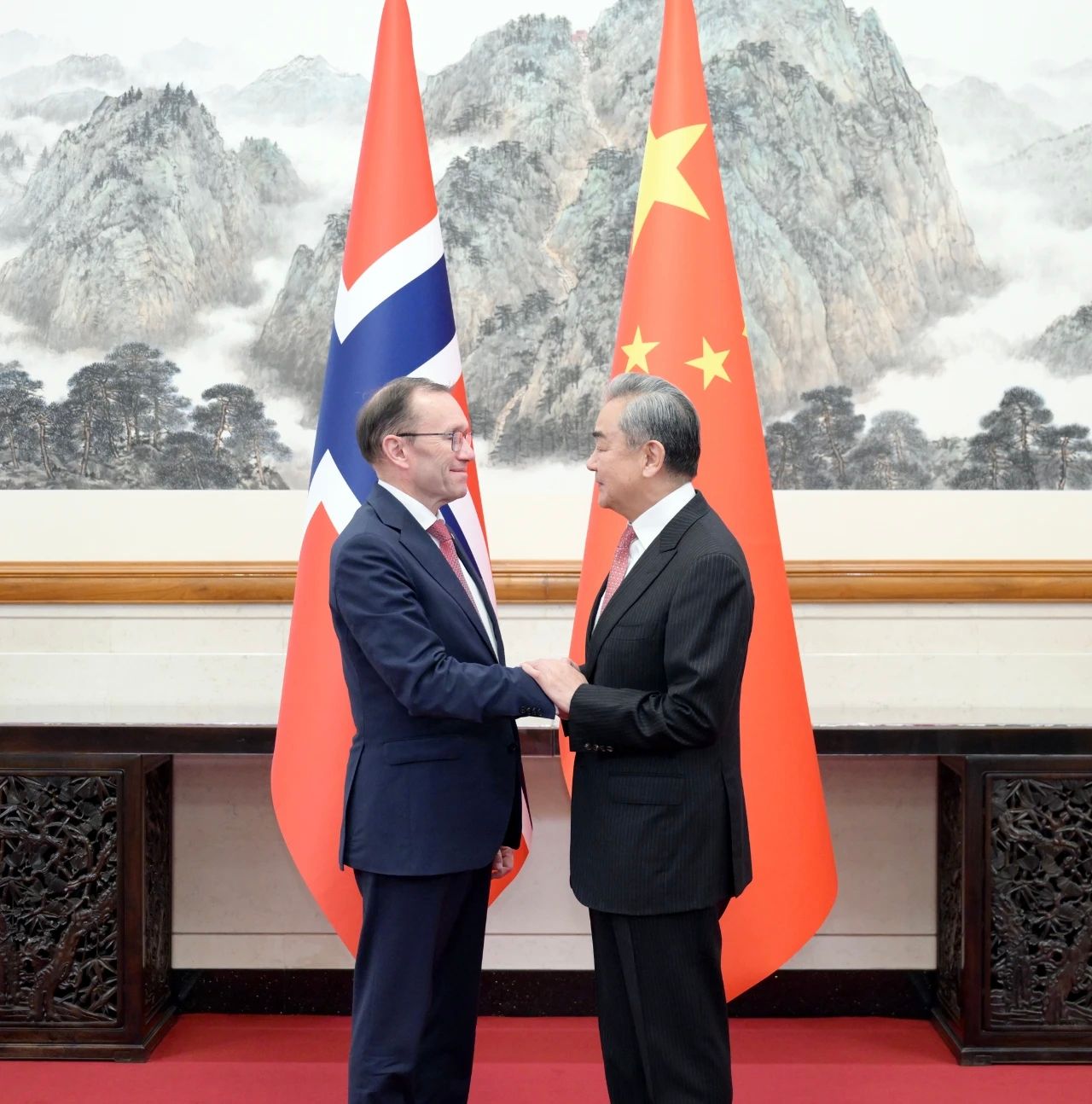 Wang Yi påpekte at Norge var blant de første landene som anerkjente og etablerte diplomatiske forbindelser med det nye Kina.Kina setter pris påat Norge konsekvent har holdt fast vedett-Kina-prinsippet,og ser påNorge som en viktig og stabil partner i Europa.I fjor feiret de to landene70-årsjubileet for diplomatiske forbindelser.PresidentXi Jinpingog statsministerJonas Gahr Støremøttes i Beijing og ble enige omåskape et nytt,strålende kapittel for de neste70årene av det kinesisk-norske forholdet.Wang uttrykte håp om at Norge vil fortsette sin positive,stabile og pragmatiske Kina-politikk,og at begge sider vil iverksette ledernes viktige enighet,respektere hverandres kjerneinteresser,ivareta hverandres store bekymringer,og fremme etåpent og vinn-vinn samarbeid foråløfte forholdet til et nytt nivåmed flere resultater.