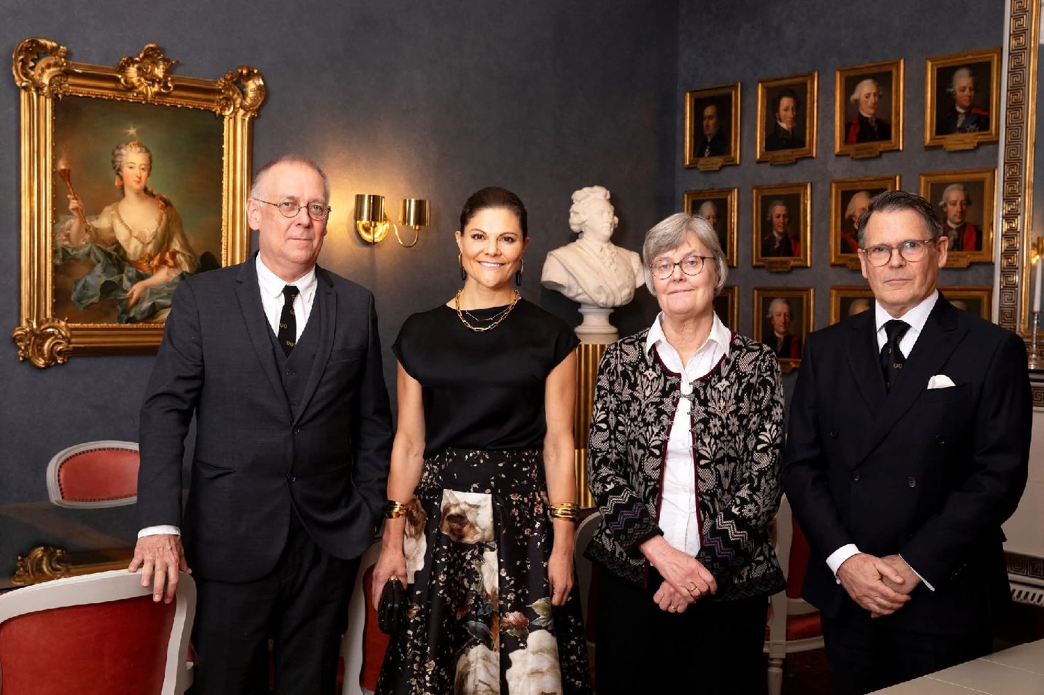 他们站在由历届学院领袖与文化先贤肖像环绕的会厅中,背景中的古典油画与雕塑象征着瑞典深厚的人文传统。维多利亚公主以优雅亲和的姿态参与交流,表达了皇室长期以来对瑞典文化、历史与学术事业的关注与支持。