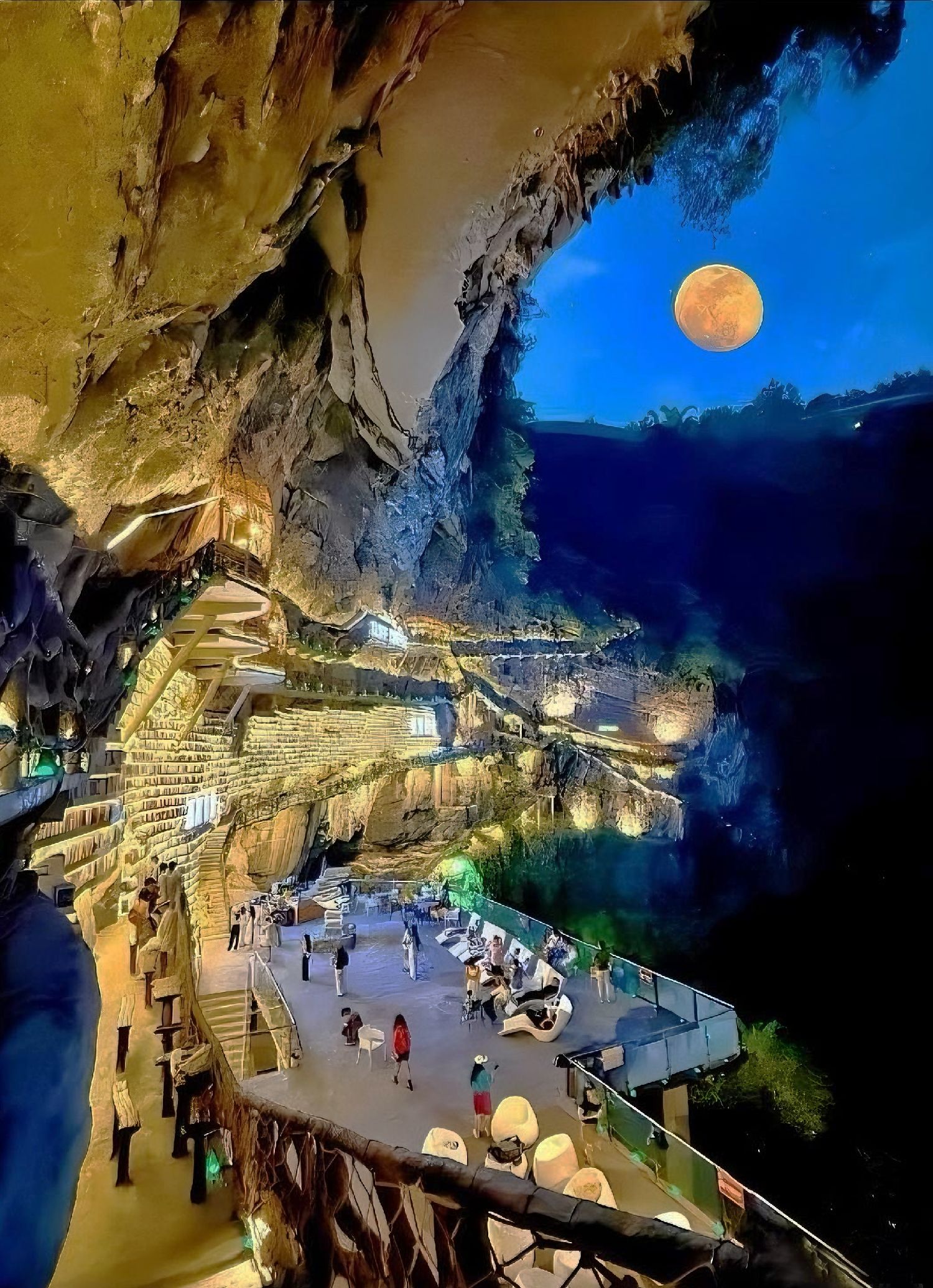 As night fell and lights began to glow,the Cliffside Bookstore stood majestically against the sinkhole—like a scene from a dream.Thousands of books stood quietly under the soft glow,waiting for the thousands of visitors who arrive each day.Backed by steep cliffs and facing a vast landscape,the bookstore blends seamlessly with the natural splendor of the Cotton Flower Sinkhole—truly breathtaking.